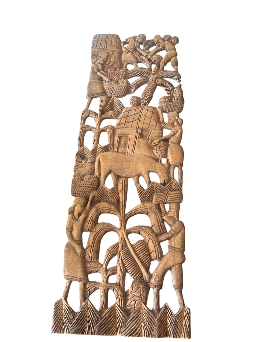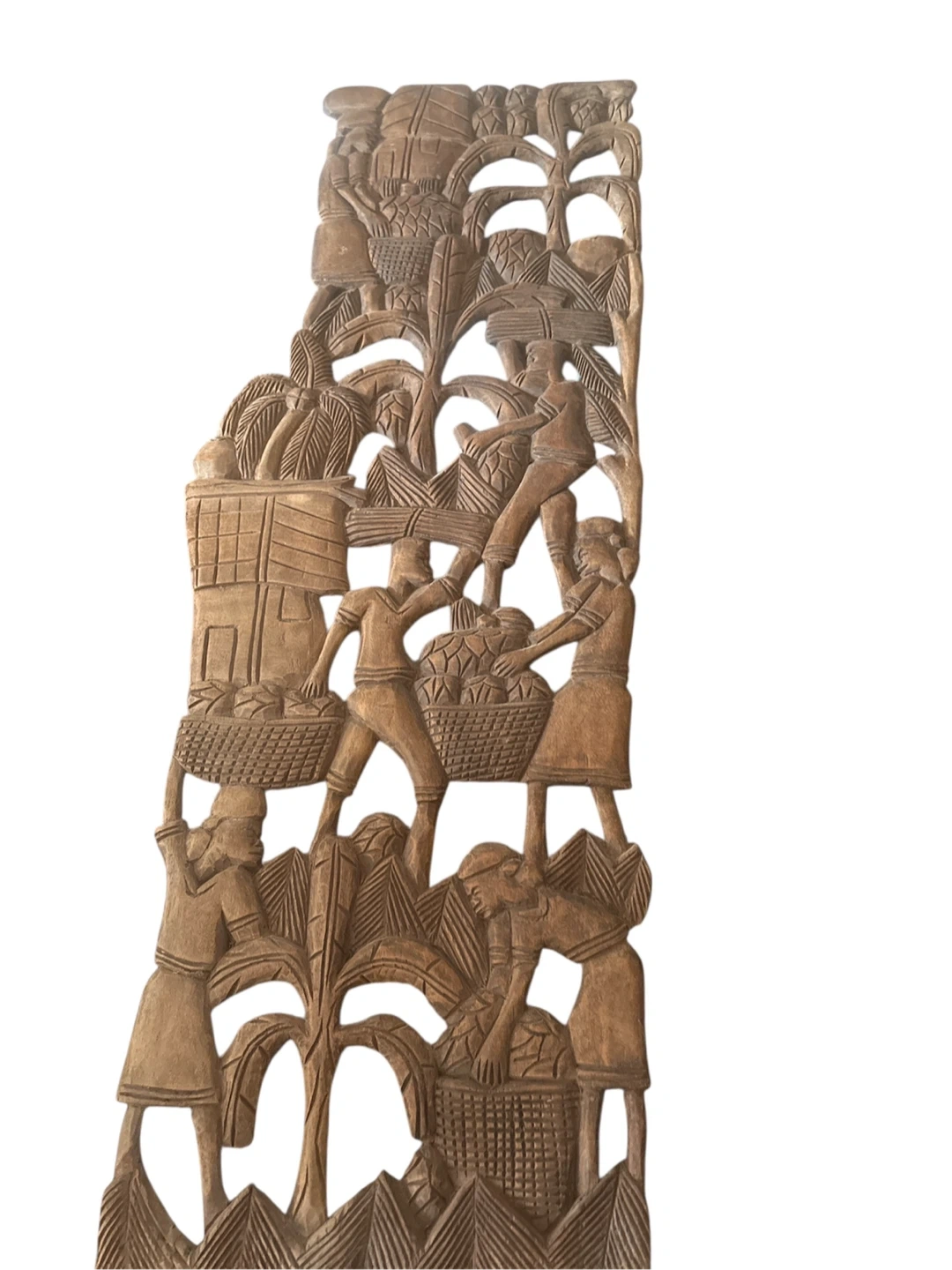 Pair of Detailed wooden relief carving depicting life and harvest. Crafted from wood with intricate detail throughout. Either African or Haitian from 20th century works