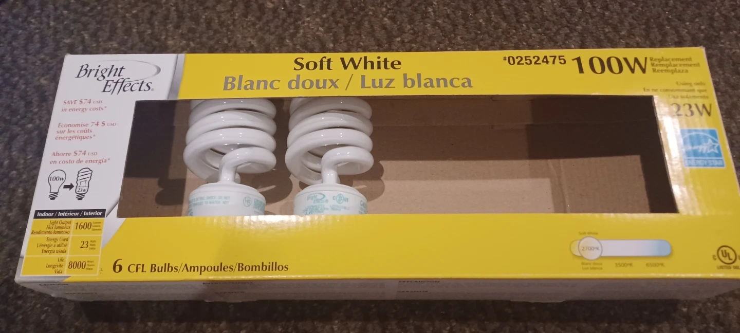 Brighten up your home with these Bright Effects CFL light bulbs! These bulbs are equivalent to 100W but only use 23W, saving you energy and money. They provide a soft white light with 1600 lumens and have a long life of 8000 hours.