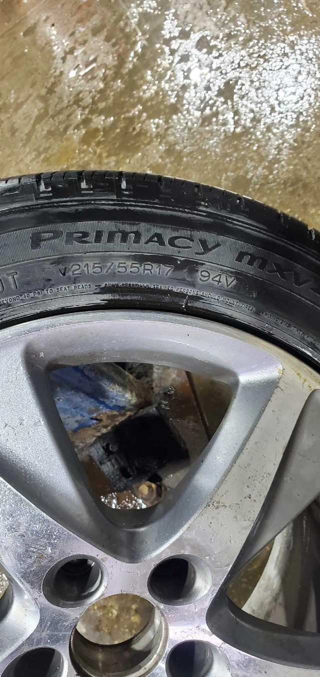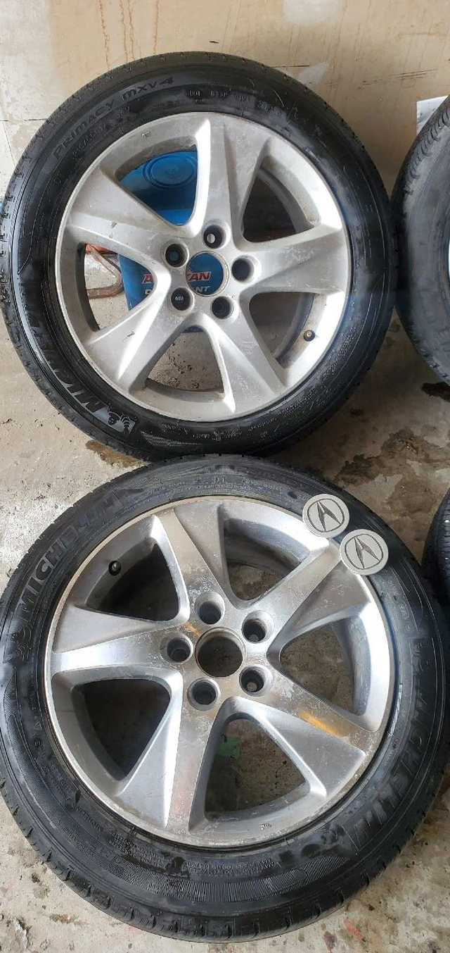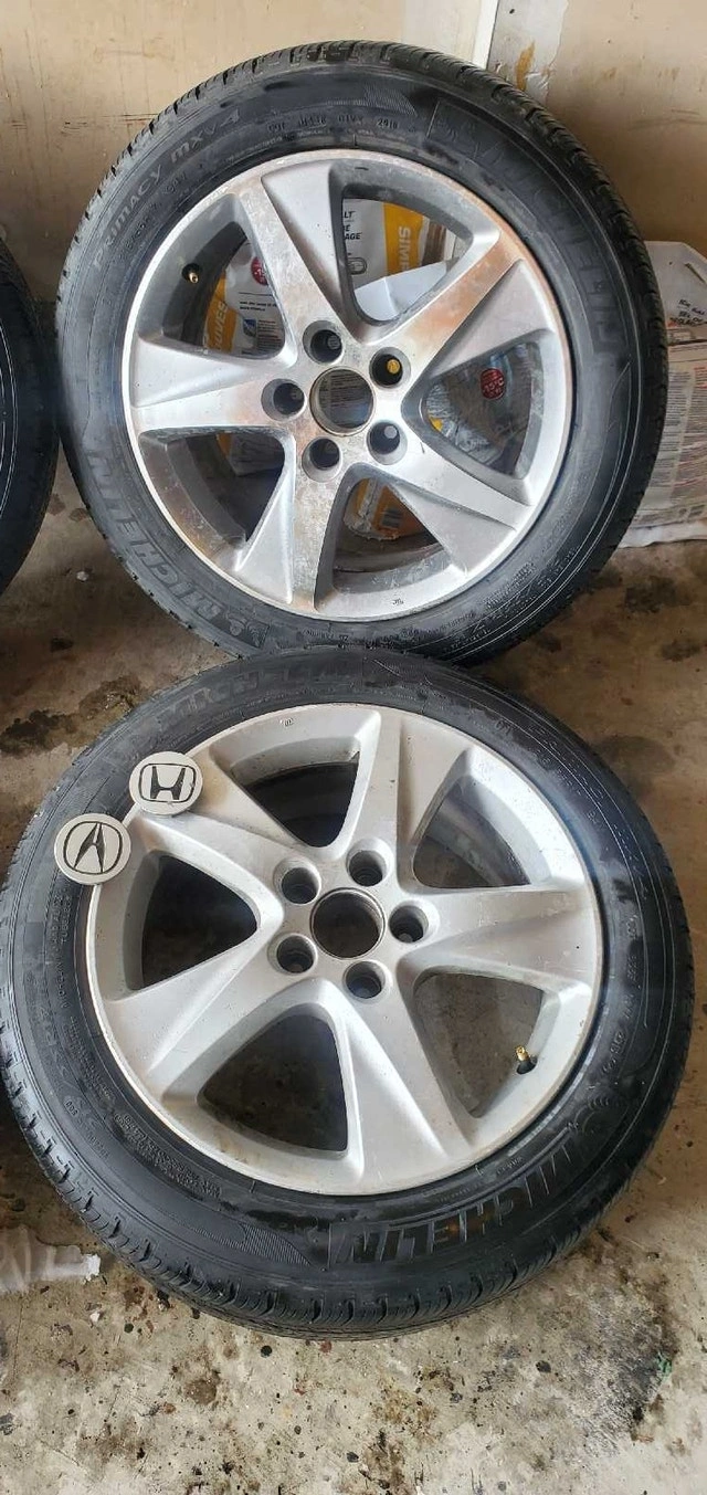 Set of 4 Michelin Primacy MXV4 tires mounted on OEM alloy rims. Tire size is 215/55R17 94V. These came off a 2009-2014 Acura TSX. Includes three Acura center caps and one Honda center cap. They are in good condition. Rim spec is 7x7.5J ET55. $650 or best offer.