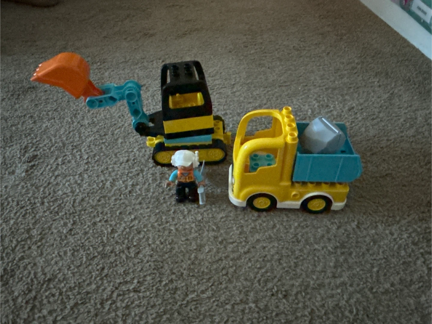 This LEGO DUPLO set includes a yellow construction truck with a teal dump bed and a yellow and black excavator with an orange bucket. It also comes with a DUPLO figure wearing a safety vest and helmet. The truck can carry the included grey block. Great for young builders who love vehicles!