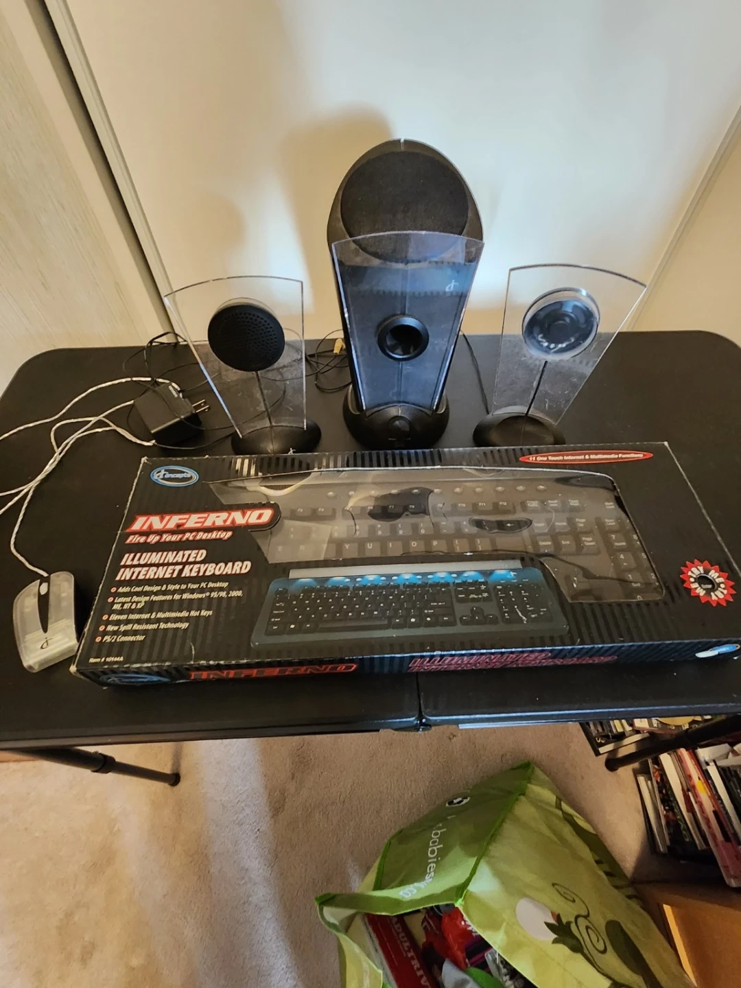 Complete computer accessory bundle including keyboard, mouse, and speaker system. Everything works as it should and is in good condition.
