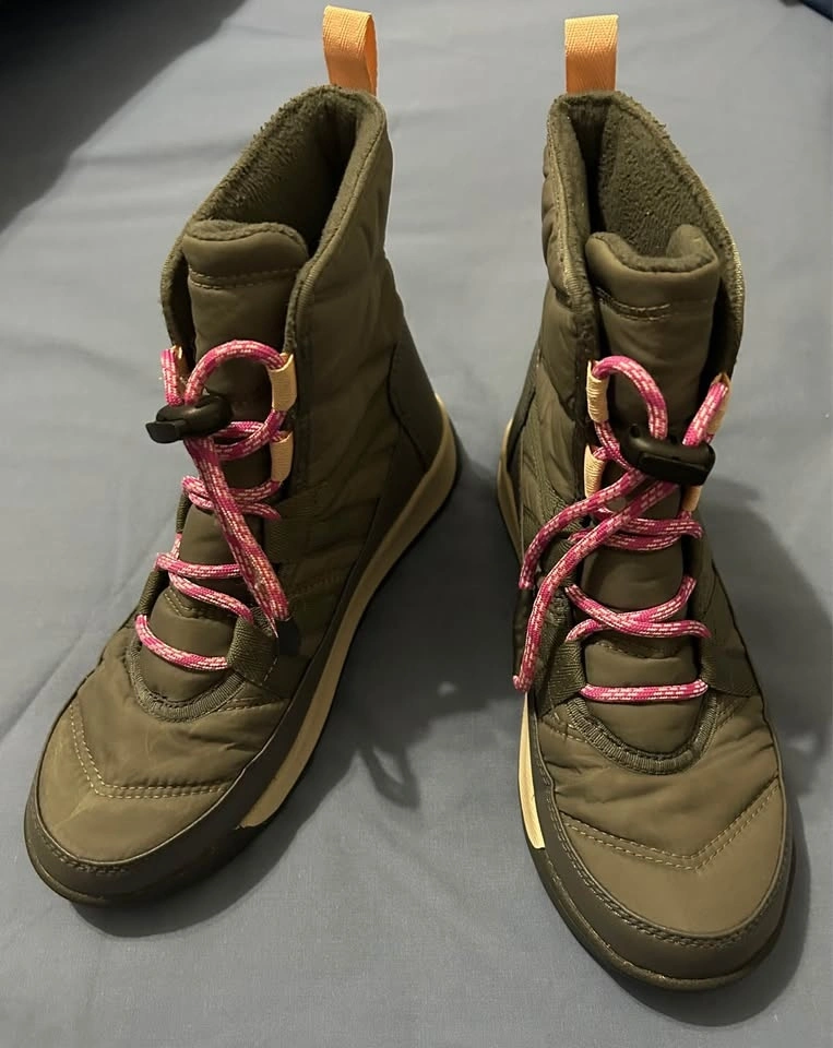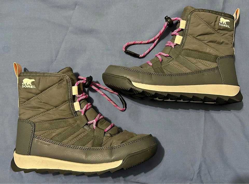 Get out in the snow in these adorable little girl Sorel Whitney II snow boots. Gray with pink details and laces. Easy on and off with bungee cord laces. Removable foot bed. Micro fleece lining. Molded rubber outsole. Youth size 3 (EU 34). Barely worn. Pick up on the upper west side of Manhattan.