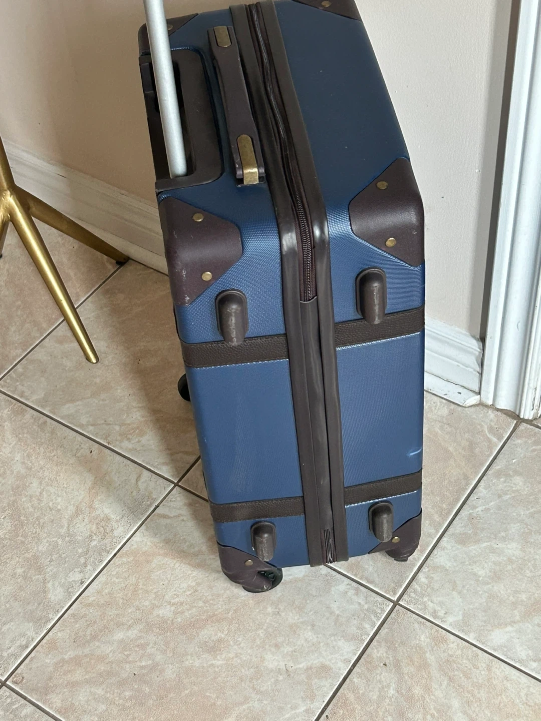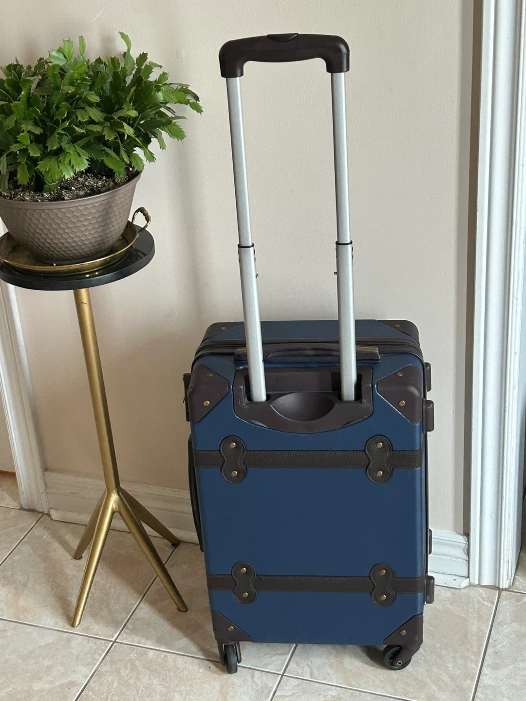 This is a blue hardside carry-on suitcase with brown faux leather trim and accents. It features a retractable handle and four spinner wheels for easy mobility. The luggage has a classic, vintage-inspired design.