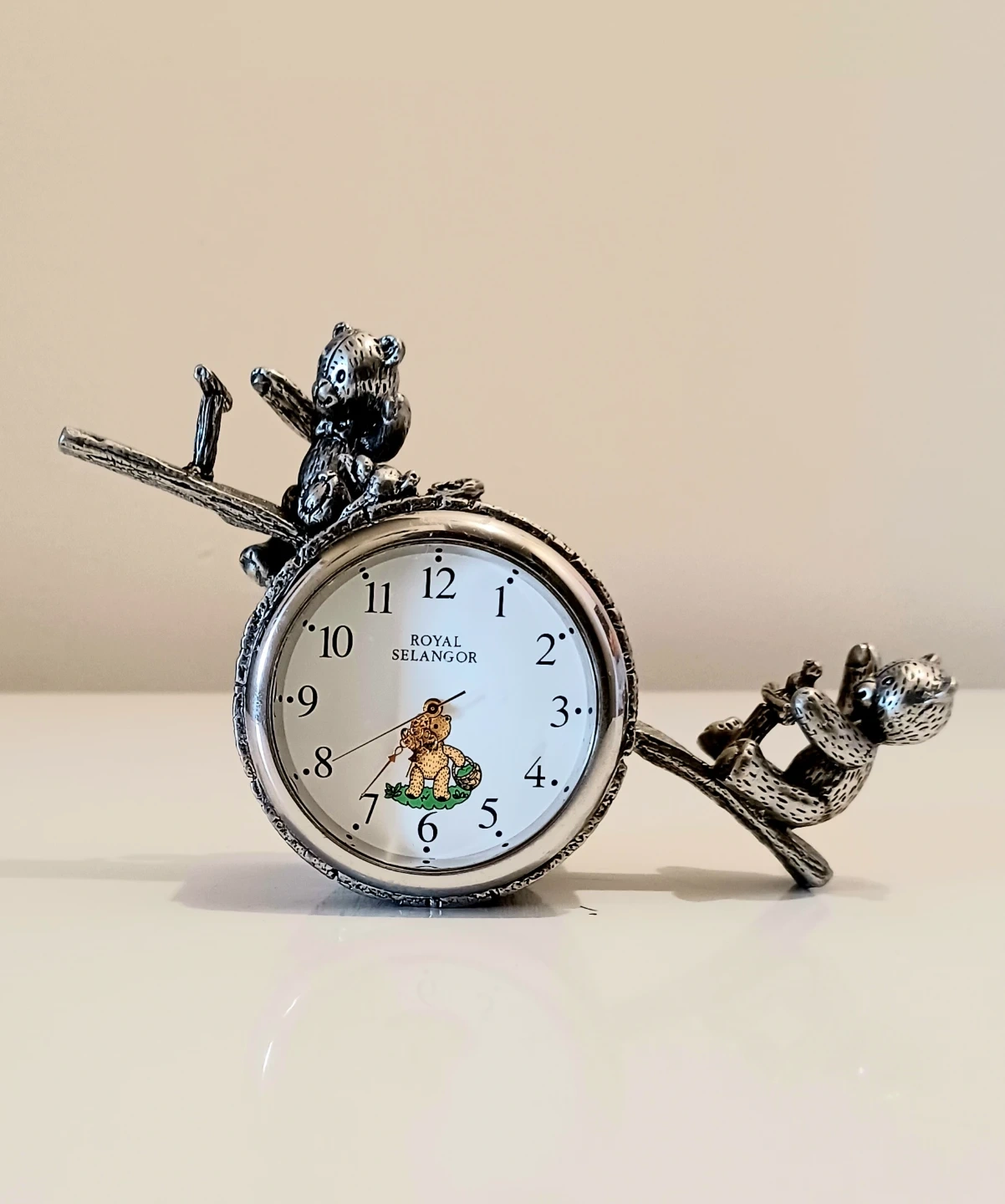 Vtg , Rare Royal Selangor pewter clock featuring adorable teddy bears, perfect for adding a touch of charm to any space! This delightful piece is in very good condition. The clock has a white face with black numbering and a second hand. It features a pewter cast of two teddy bears on a seesaw.