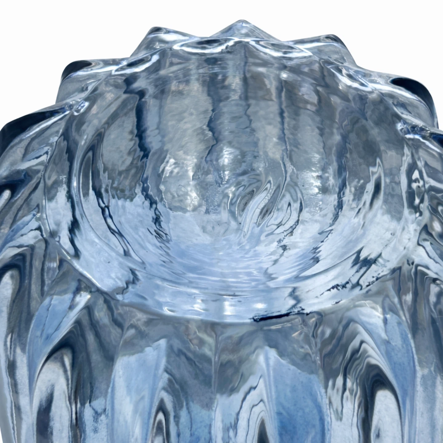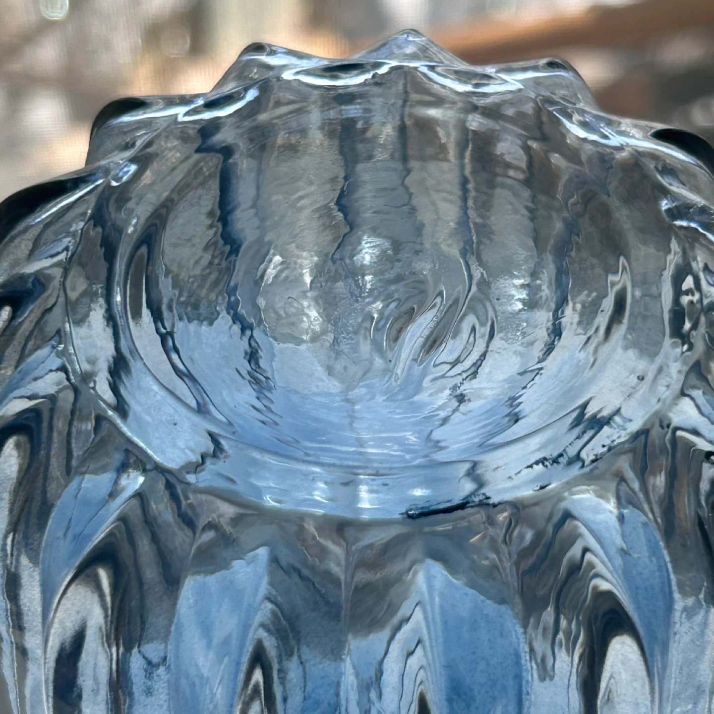 The body is evenly ribbed from base to shoulder, creating strong linear reflections and depth as light moves across the surface. The coloration shifts subtly from pale blue to near-clear depending on lighting, an effect achieved through controlled glass thickness rather than applied color. The narrow mouth and weighted lower section give the vase a poised, sculptural presence, suitable for display with or without stems.