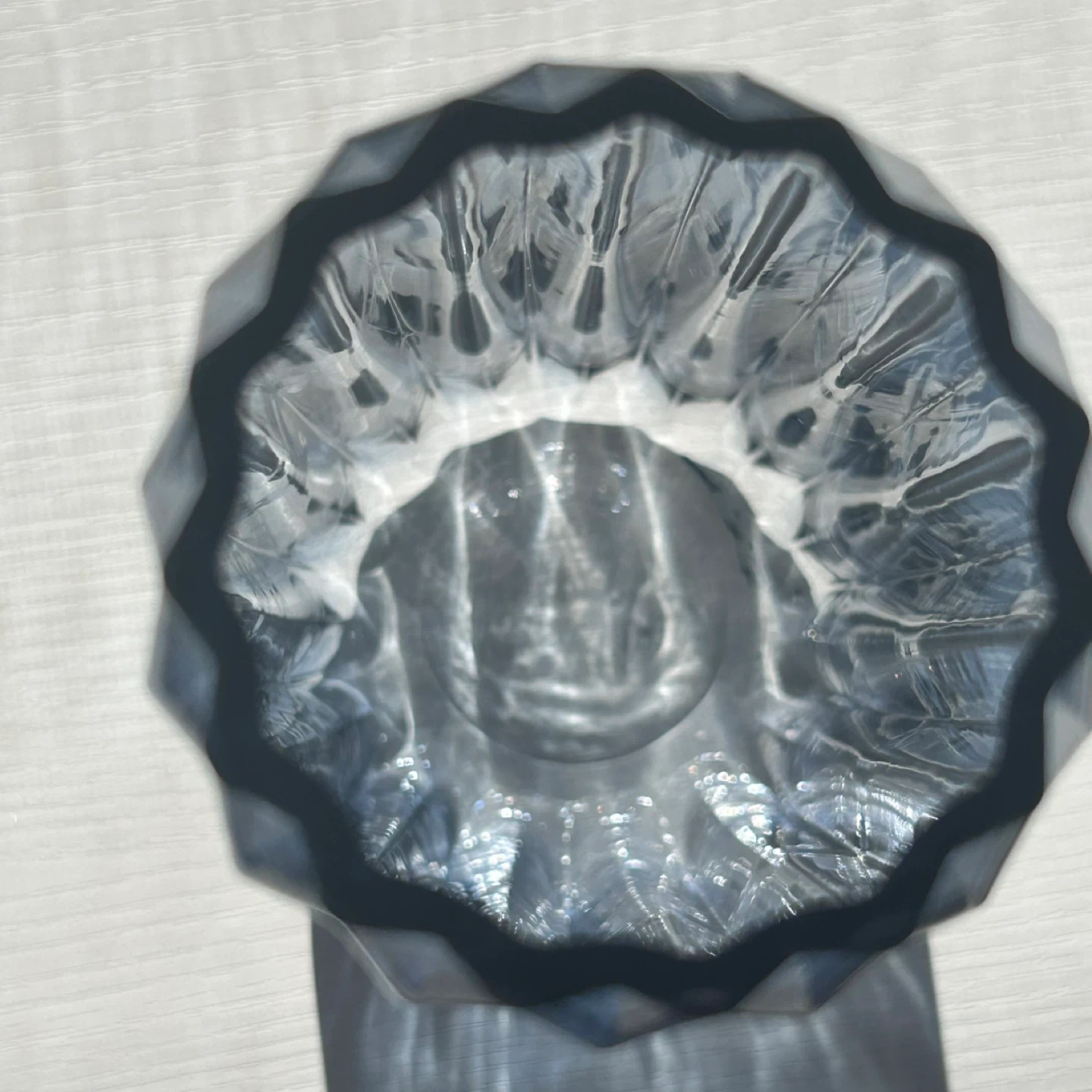 Unmarked, with construction and finish consistent with late 20th-century studio or decorative art glass production. While the aesthetic aligns broadly with modernist glass traditions seen across Europe and North America, no specific maker or regional factory can be conclusively identified. The vase is therefore offered by form, period, and technique, not by named attribution.