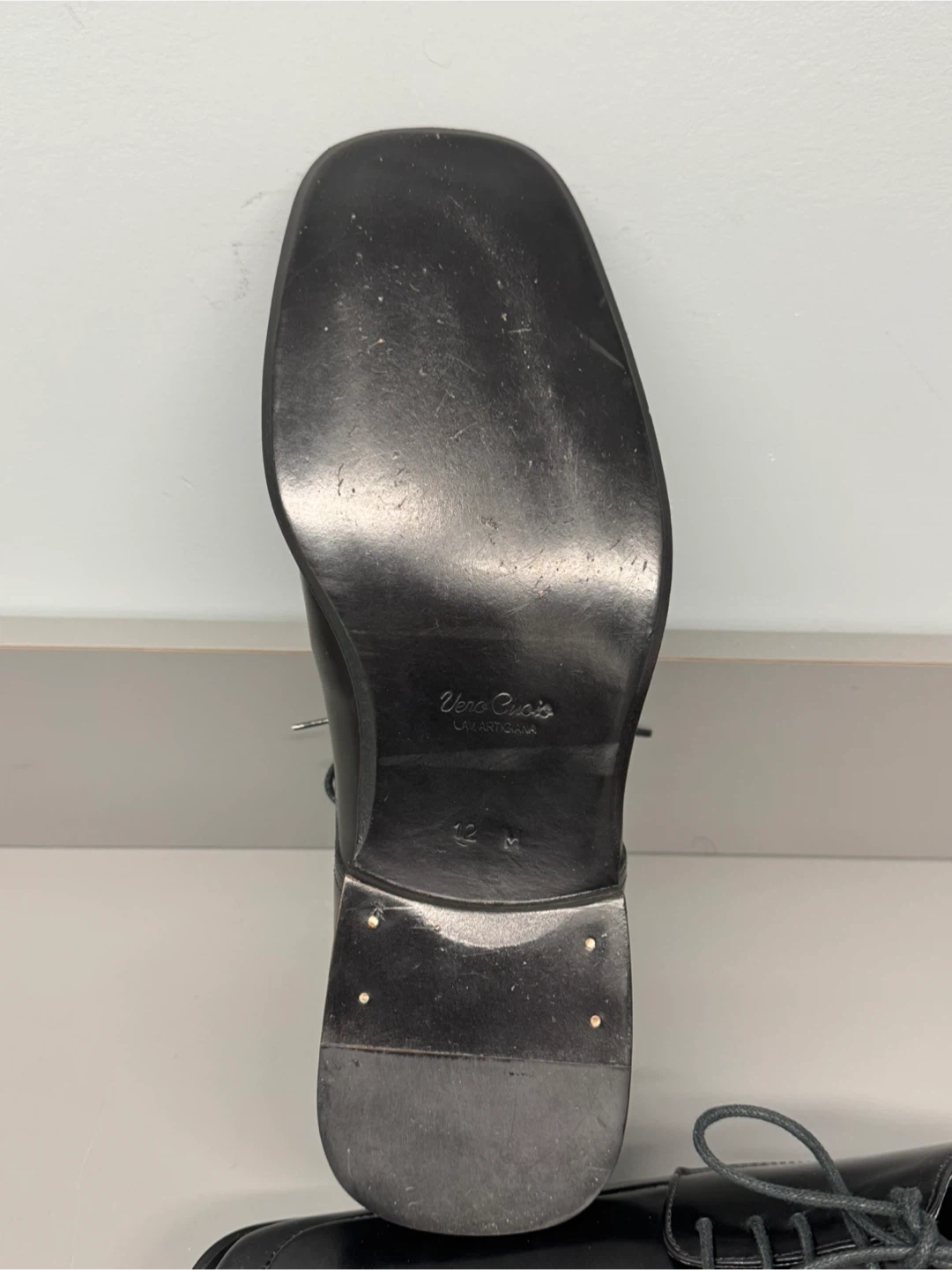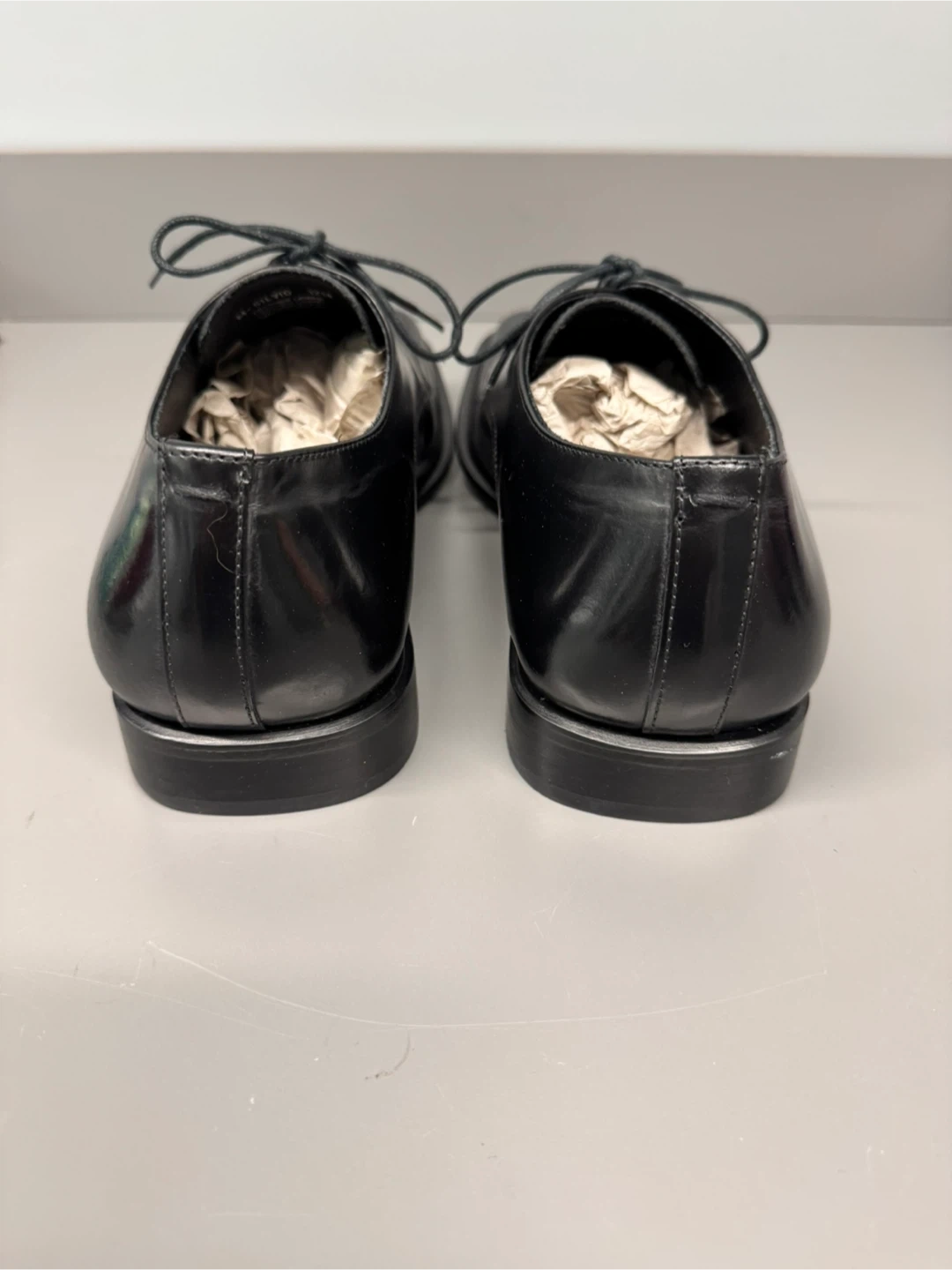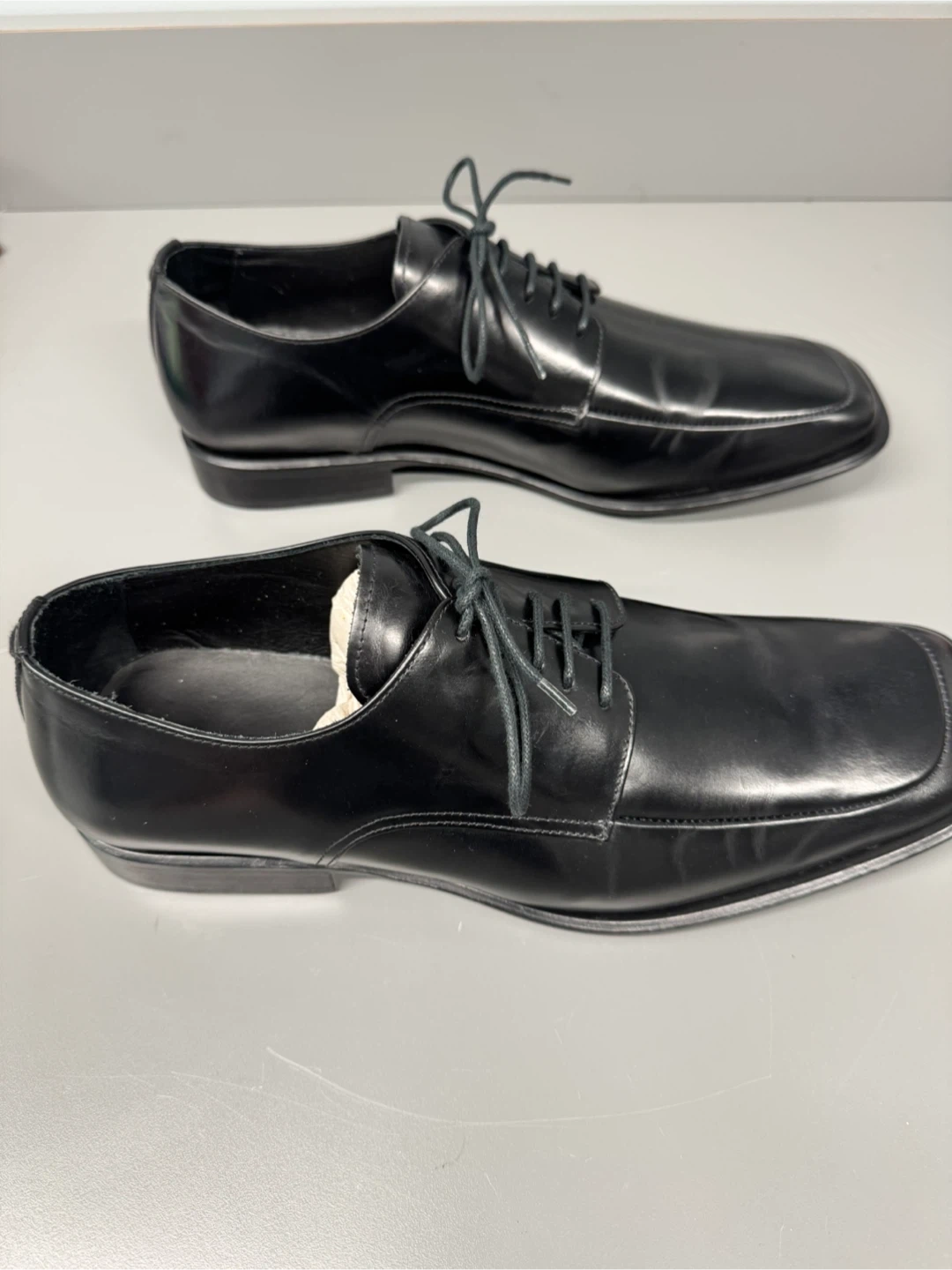 Classic black dress shoes with a square toe design. These lace-up shoes offer a sleek look for formal occasions. Made with a shiny synthetic material.