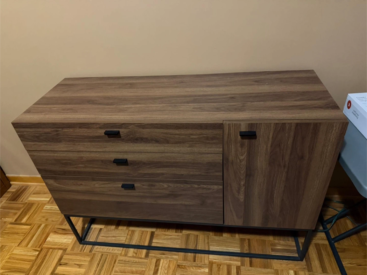 This modern sideboard features a walnut finish with black hardware. It has three drawers on the left and a cabinet door on the right for storage. The metal base provides a sleek look.