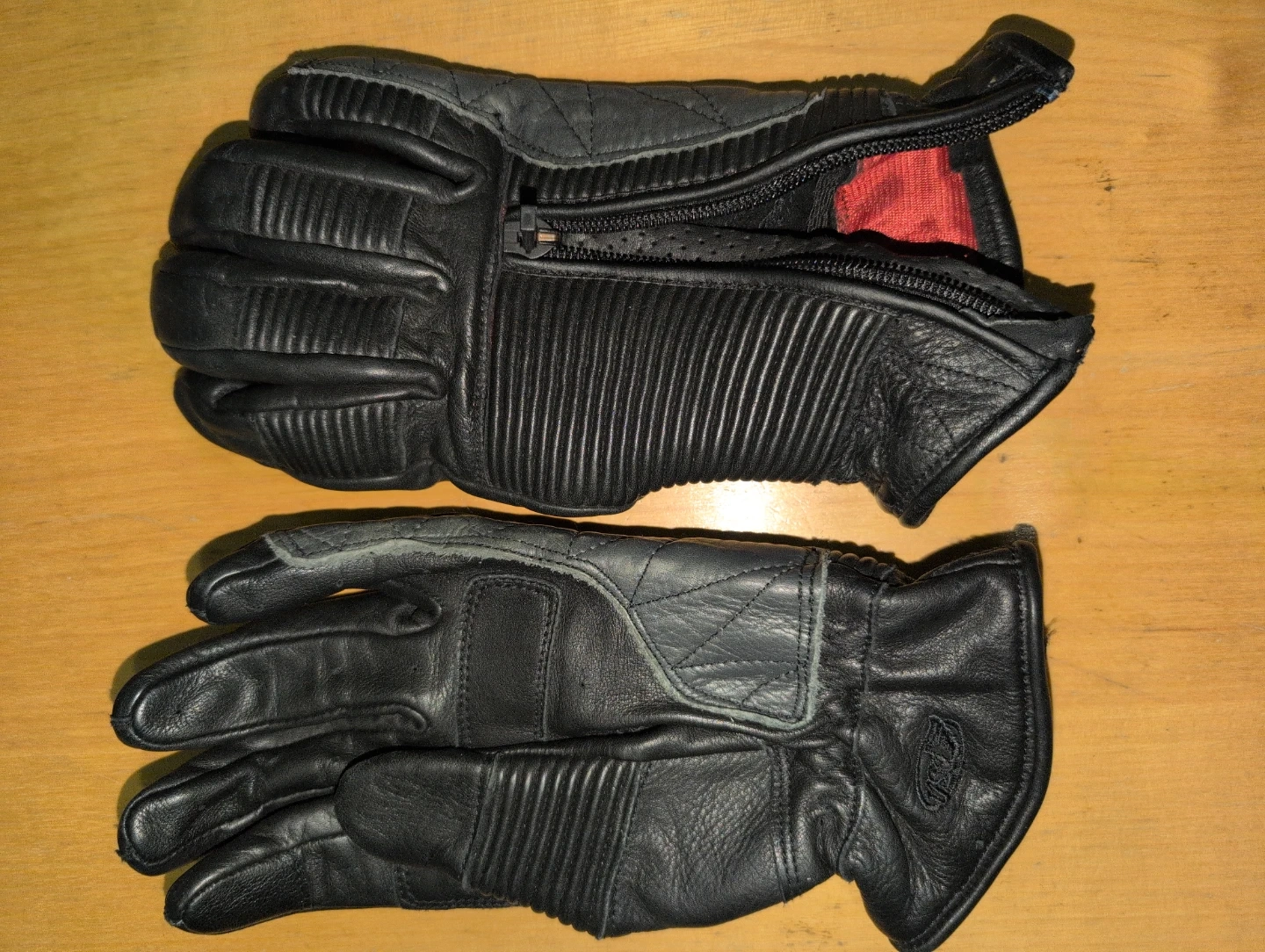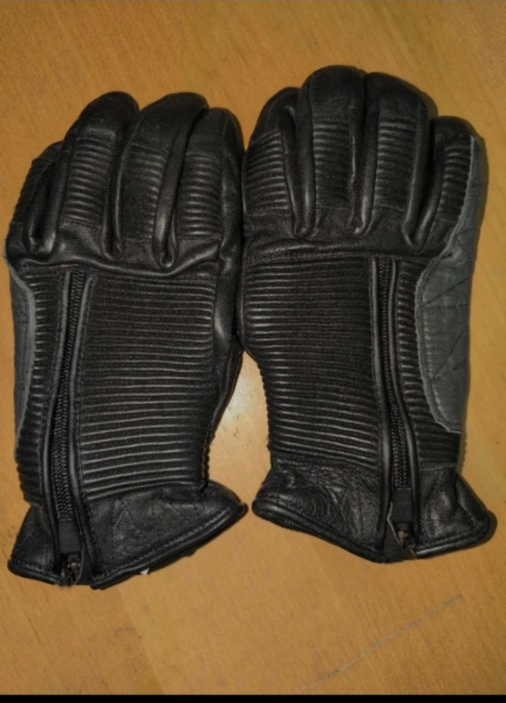 Black leather motorcycle gloves from Roland Sands Design. Shell is 100% genuine leather and lining is 100% polyester. They're designed with a zippered closure for a secure fit. These gloves are a size L.
