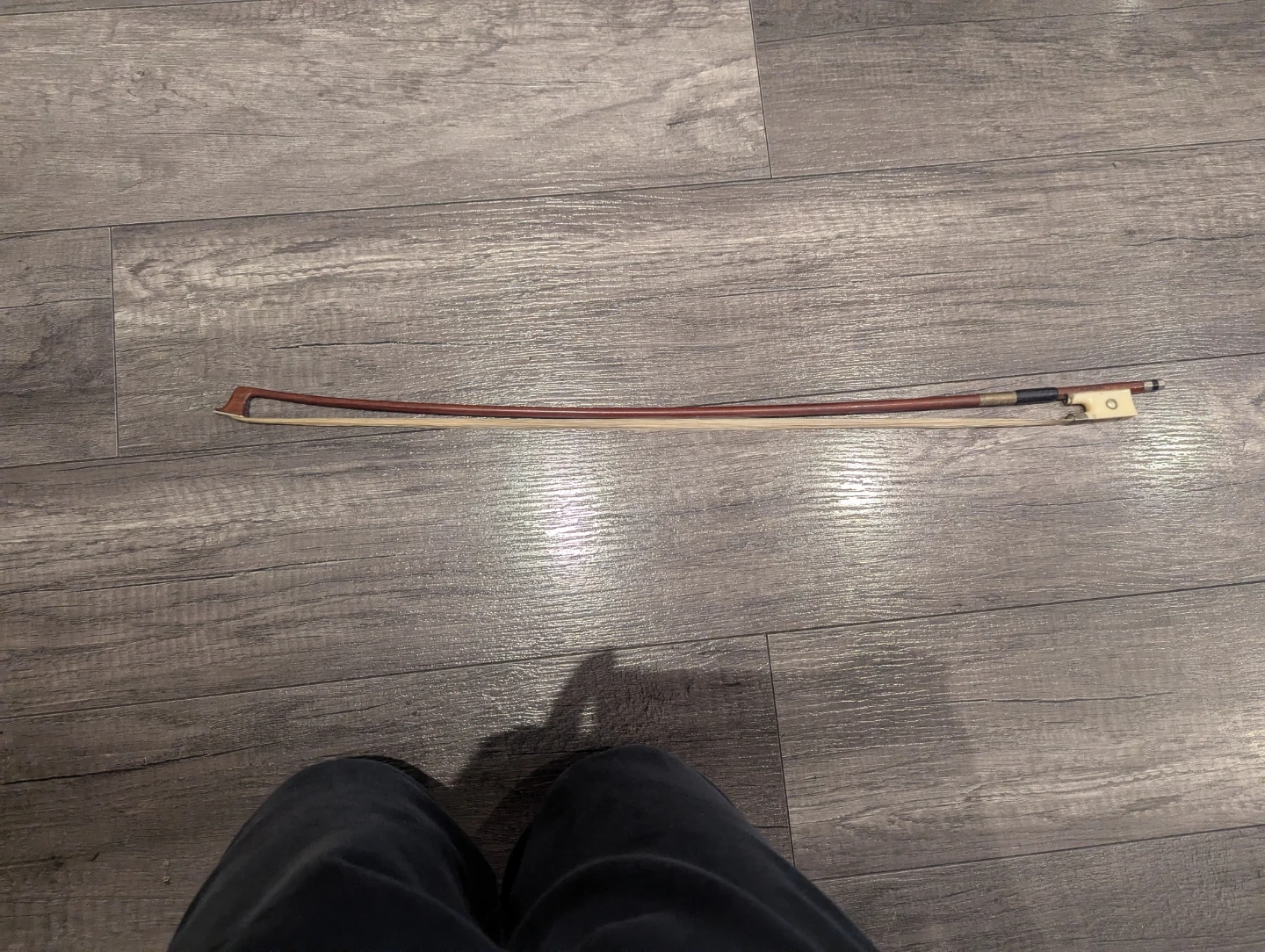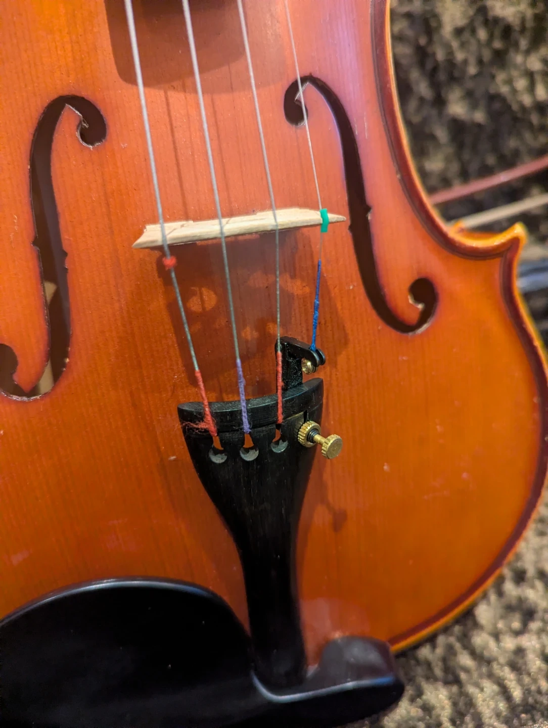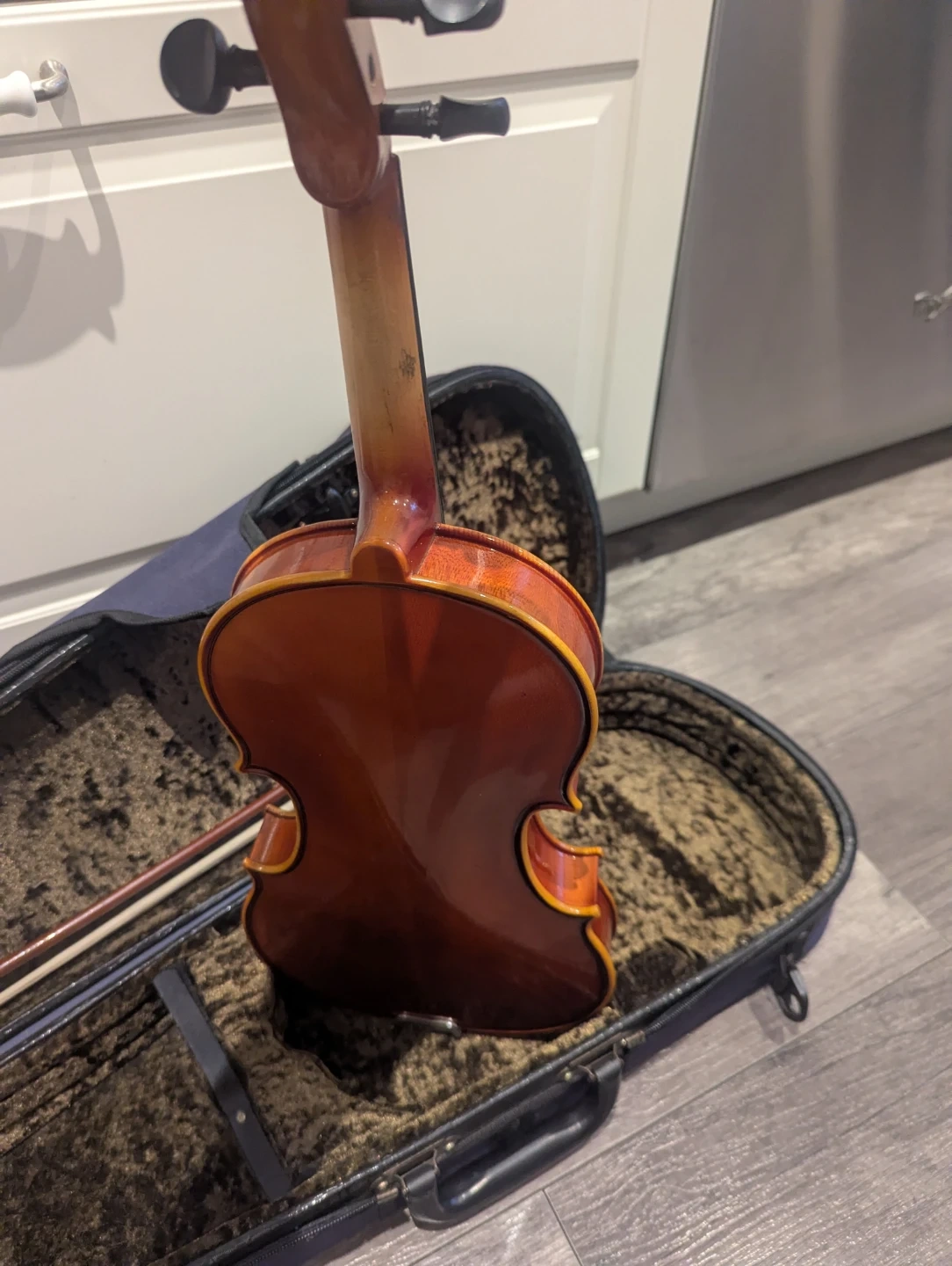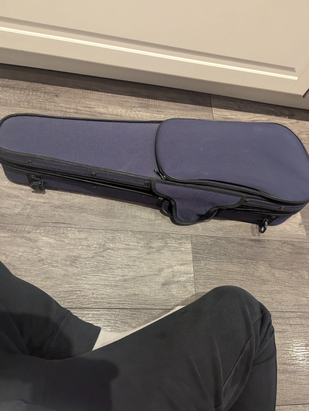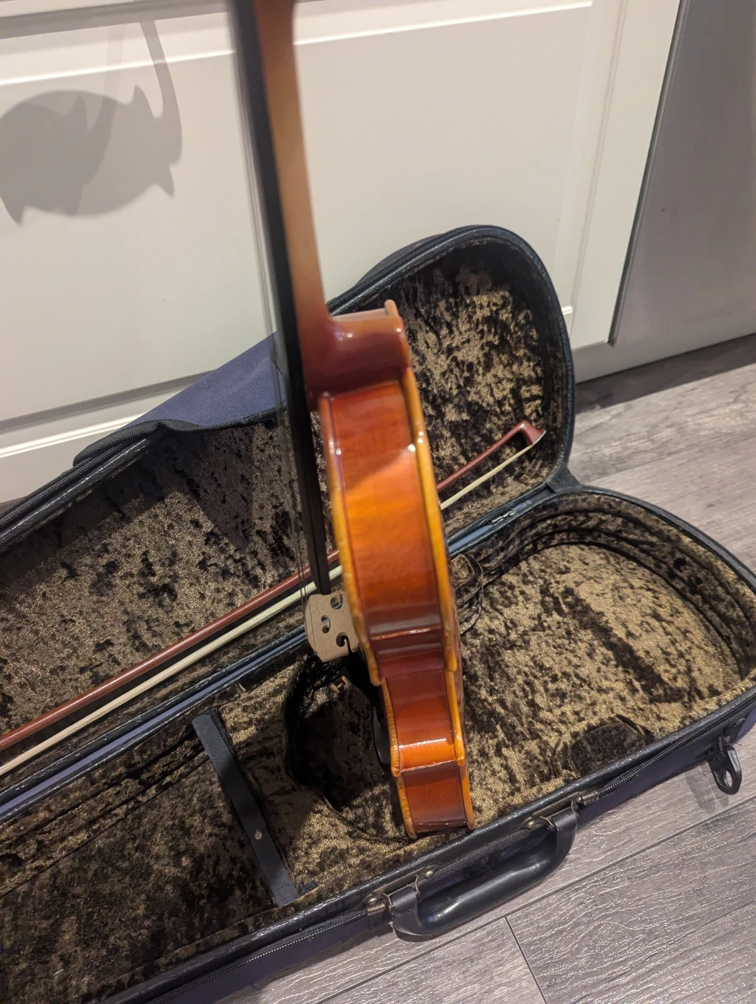 This is a used violin complete with a bow and its hard case. It's a standard string instrument for aspiring musicians. The case is made of dark blue fabric with a plush interior to protect the violin.recently tuned