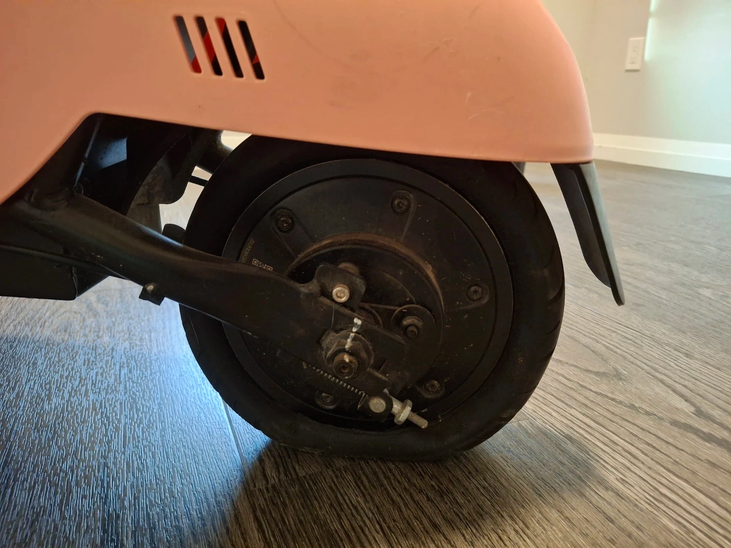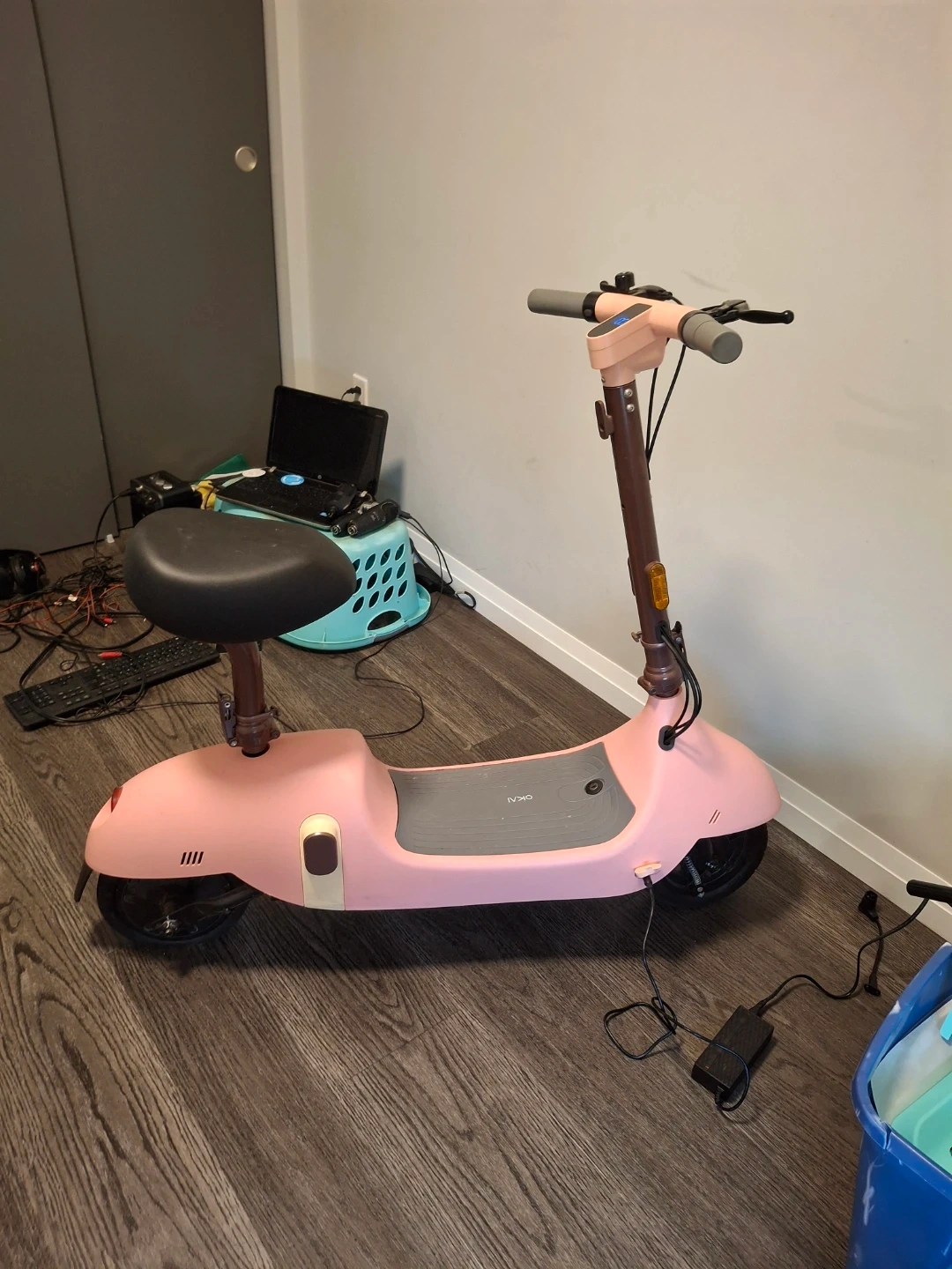 This is a pink electric scooter. It comes with a detachable seat for added comfort. It's perfect for getting around town!
