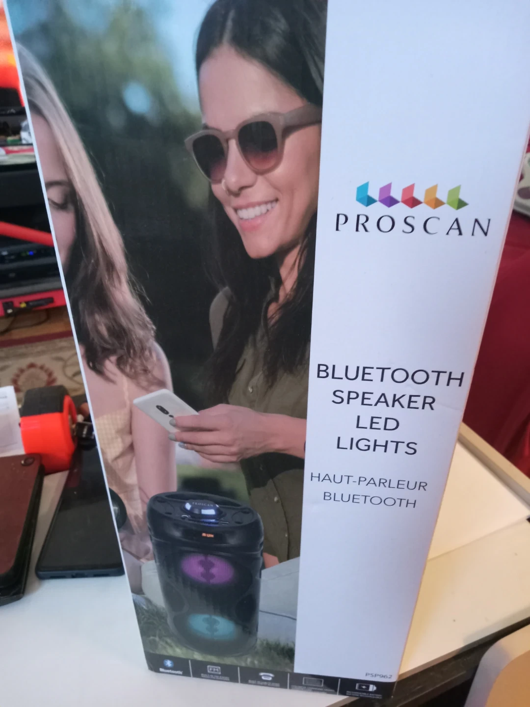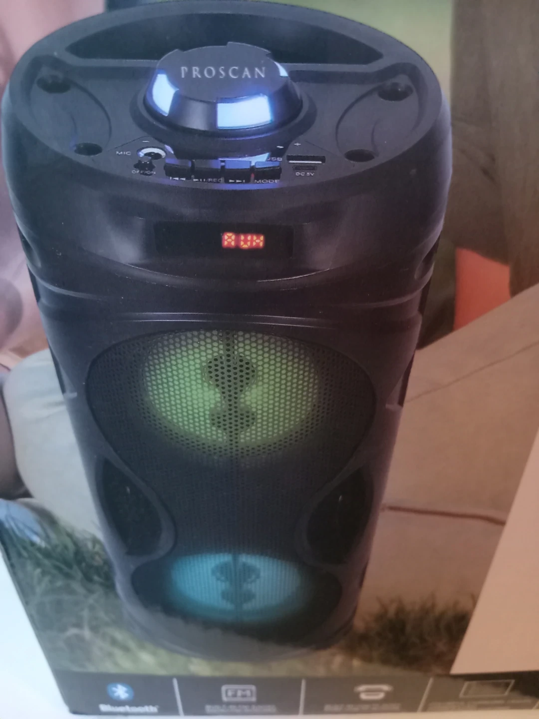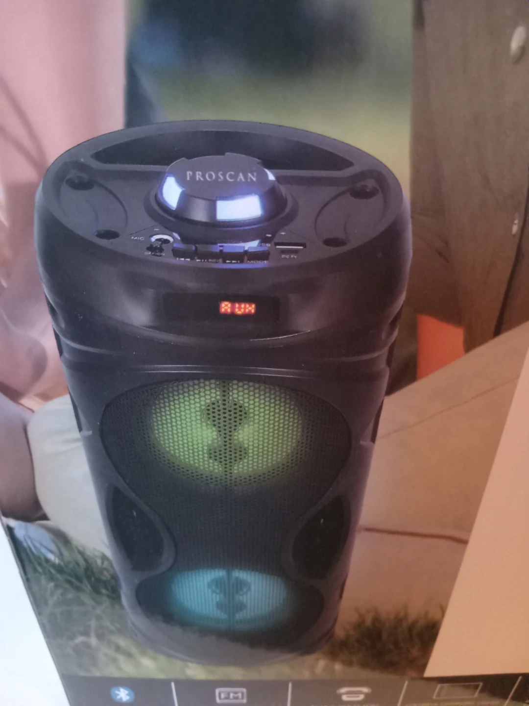 Portable party speaker with LED lights. Built-in rechargeable battery for use anywhere. Includes FM radio. Enjoy music and lights together!