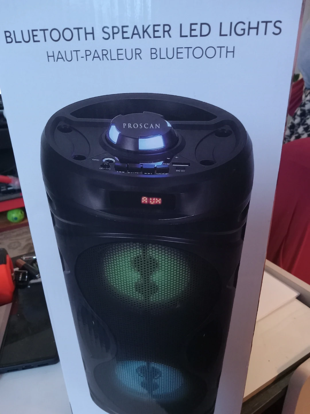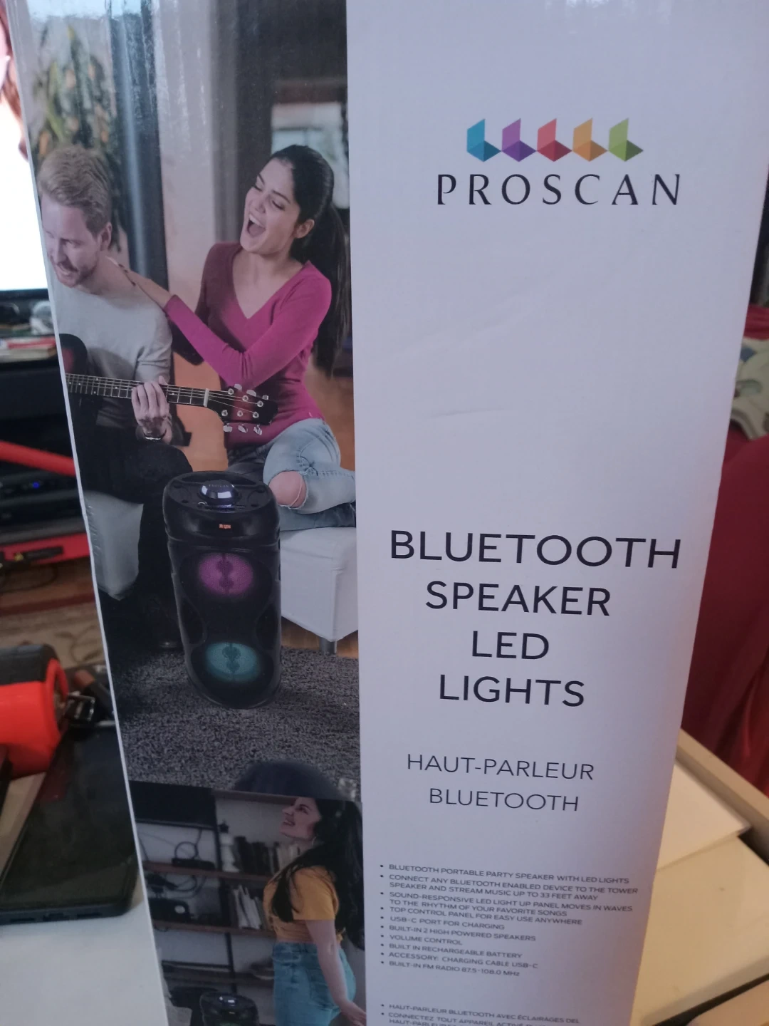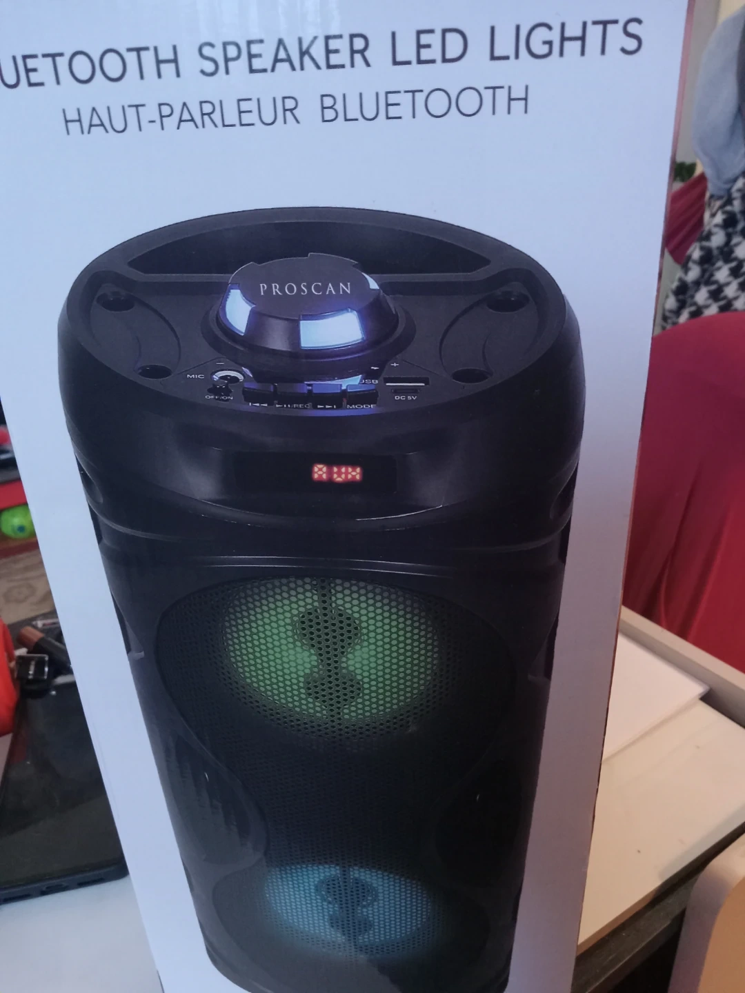 Portable party speaker with LED lights. Built-in rechargeable battery for use anywhere. Includes FM radio. Enjoy music and lights together!