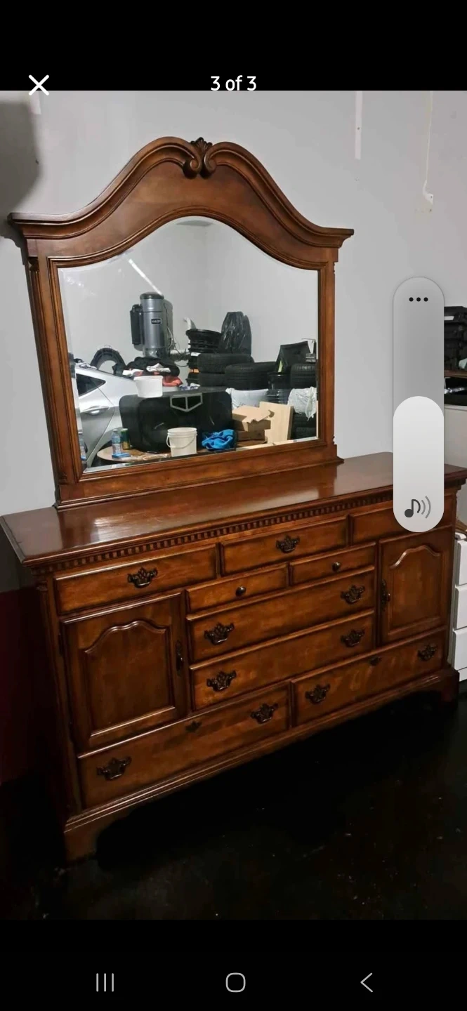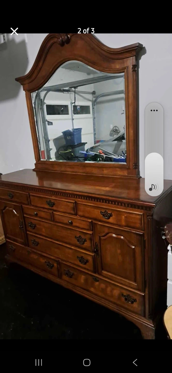 This is a wooden dresser with a matching mirror. It offers ample storage with multiple drawers and cabinet space. The rich wood finish complements many bedroom decors.