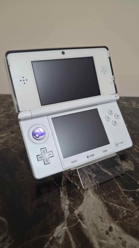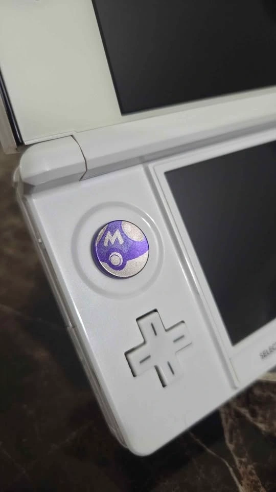 This console has had a brand new durable metal c-pad joystick installed (Master Ball engraving, Purple). It also had the standard black plastic top screen lens replaced with a white glass one, so the top screen is 100% free of wear and tear.
