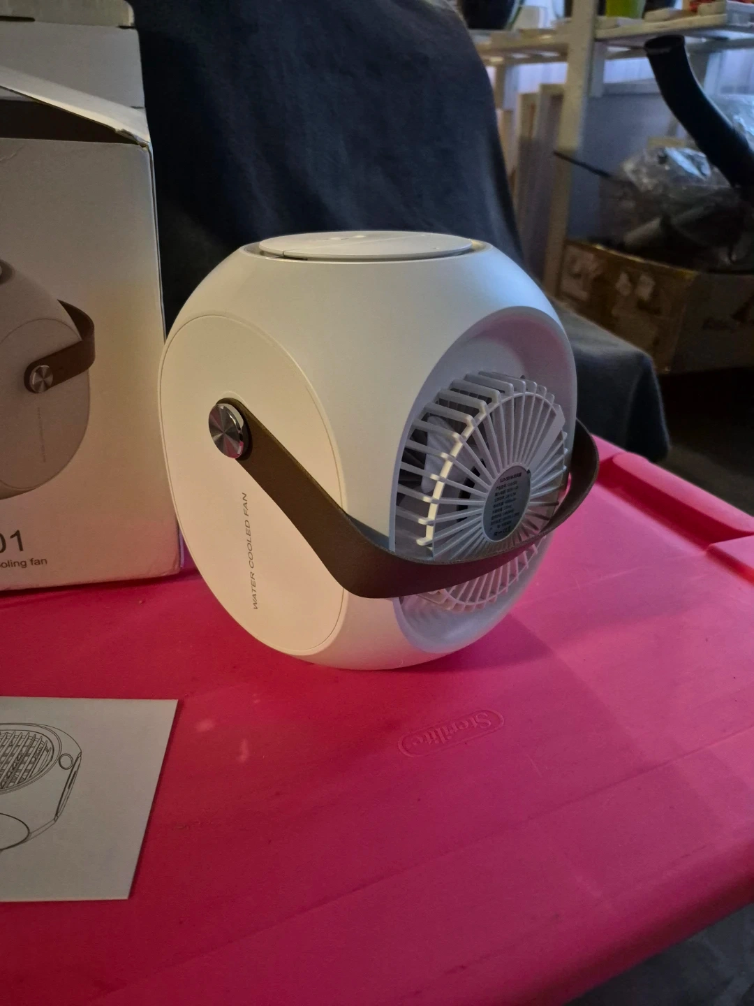 Portable S01 water cooling fan. It's white with a brown leatherette handle. Includes original box and manual. Great for personal cooling!