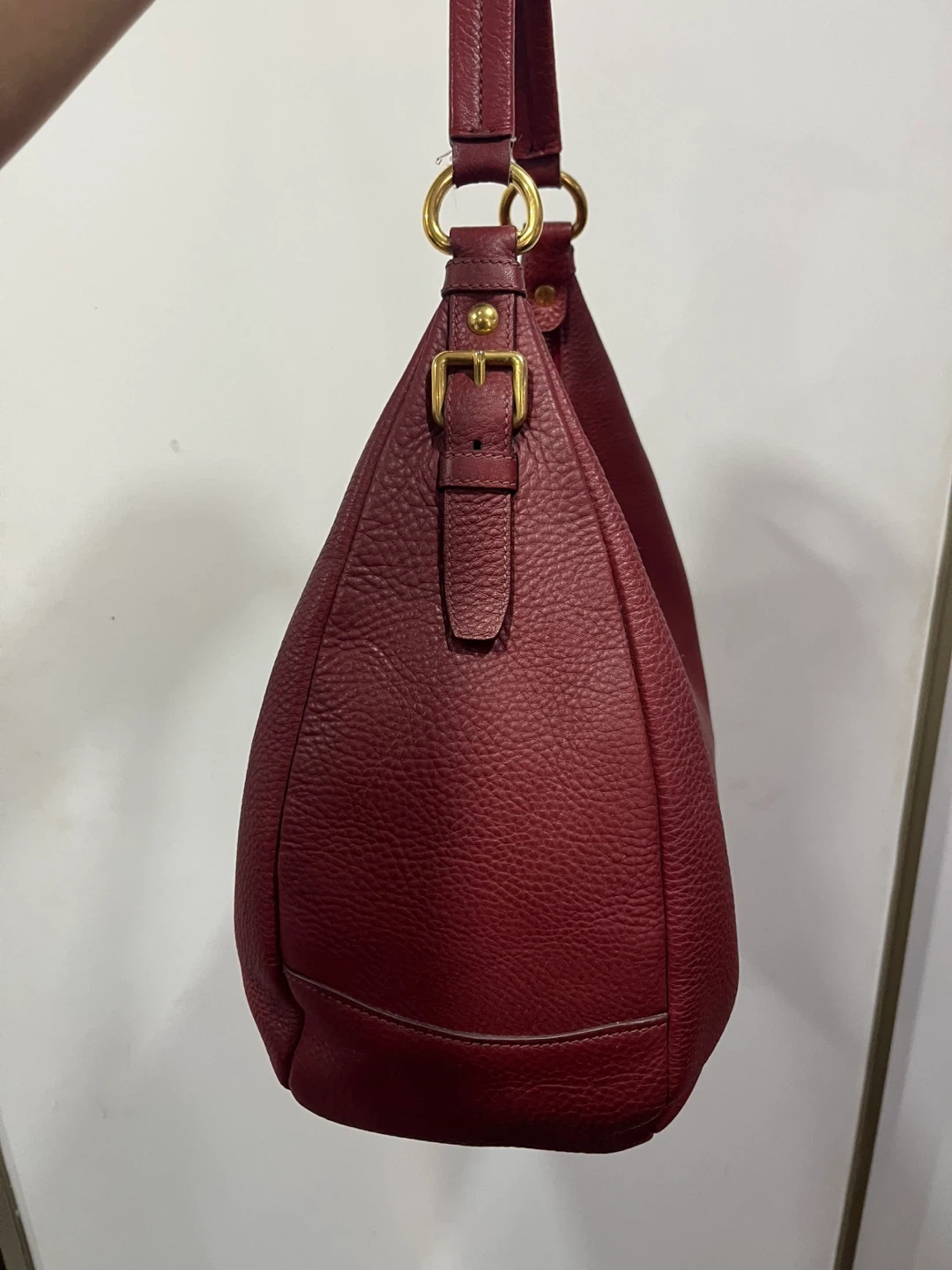 A deep red/burgundy leather shoulder hobo bag by Prada. It features gold-tone hardware and a zippered closure. This bag is made from pebbled leather.