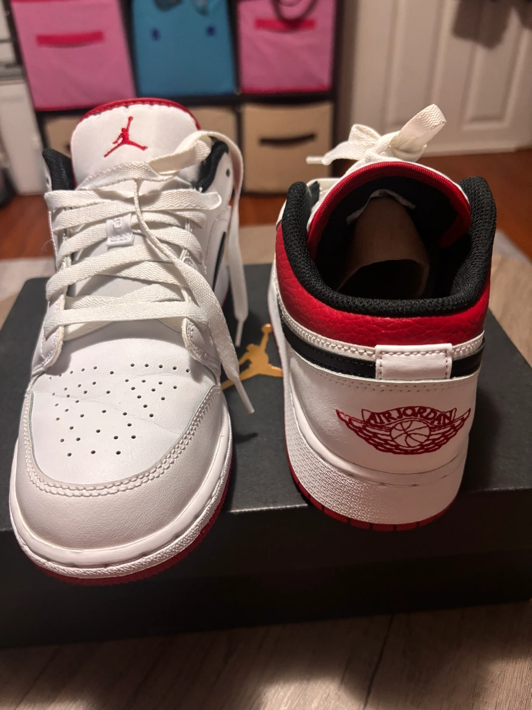 These are a pair of white and red Air Jordan 1 Low SE shoes. They feature a leather upper with a rubber sole. Includes original box.