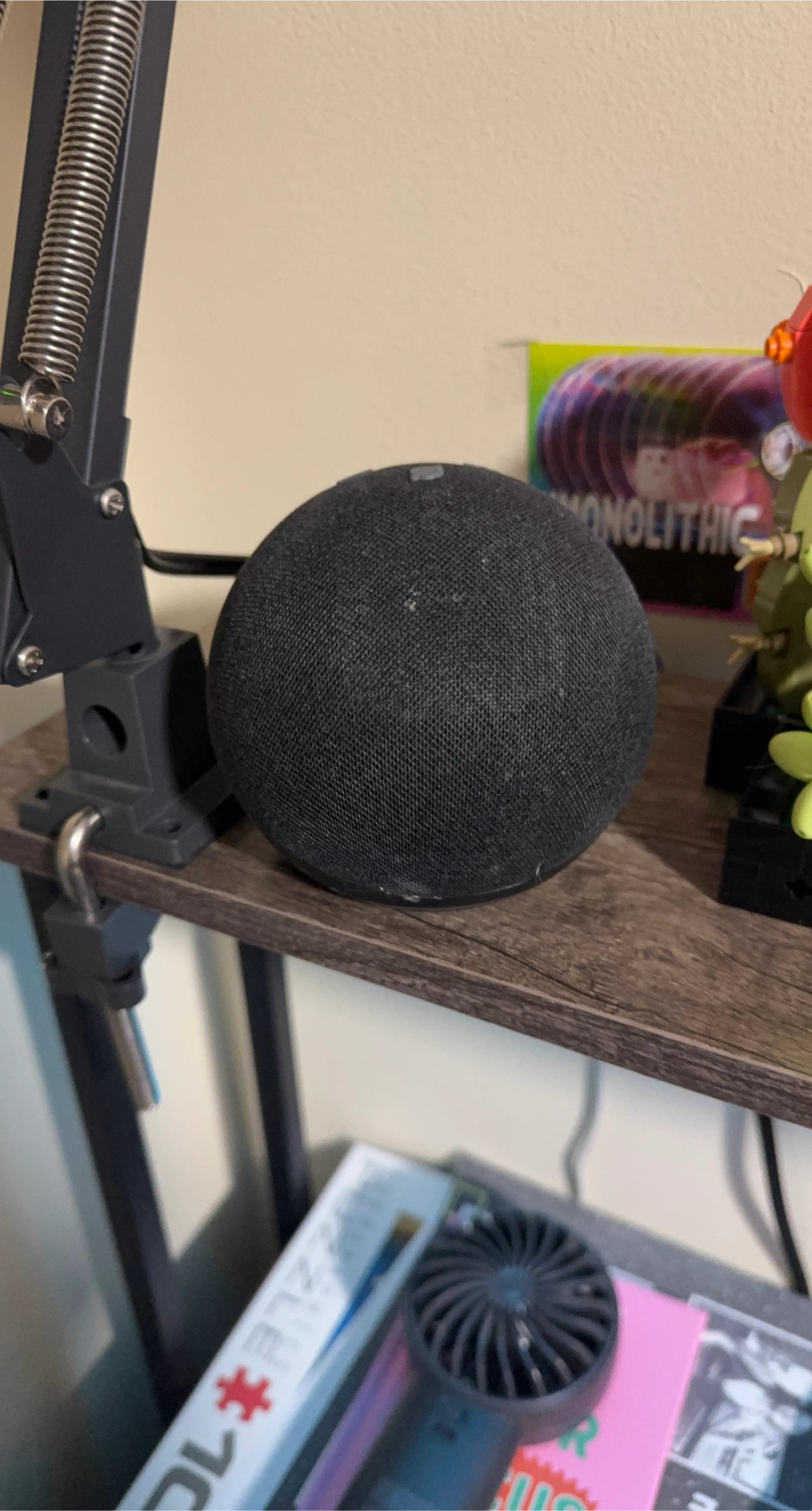 This is a charcoal-coloured Amazon Echo Dot, 4th generation smart speaker. It's powered by Alexa, allowing for voice commands and smart home control. This device is a compact sphere, designed to fit on any shelf or table.