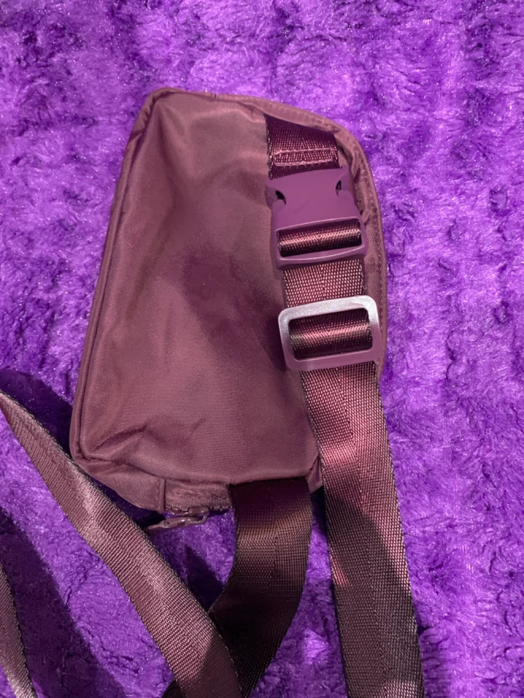 It's a Everywhere Belt Bag in a plum colour. It's made of nylon fabric and features an adjustable strap with a buckle closure. The bag has a zippered main compartment for your essentials.