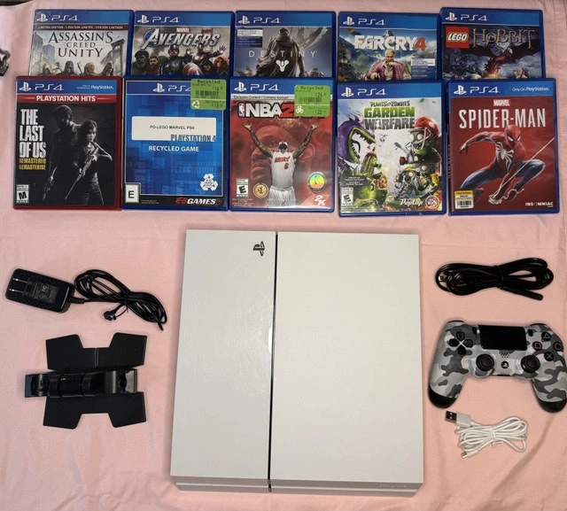 Selling my used white Limited Edition PlayStation 4 with a 500GB hard drive. It comes with a camouflage controller and a dual controller charging dock! Also included are 10 games, including Marvel's Spider-Man and The Last of Us Remastered! This PS4 set is refurbished and ready for a new home. Asking $220. If the ad is up, it's available!
