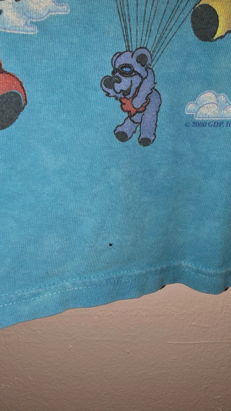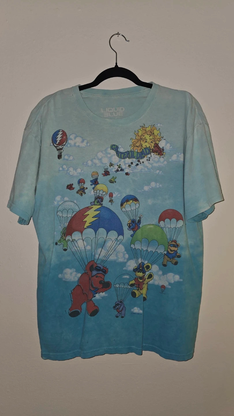 This Liquid Blue T-shirt from 2000 features a fun Grateful Dead dancing bears graphic with a skydiving theme. It's made of soft cotton. This shirt has a small hole near the collar. A hole in the middle of the torso area. Also a hole near the bottom hem. This shirt is 26 years old so some wear and tear is considered natural for a rare vintage find like this.