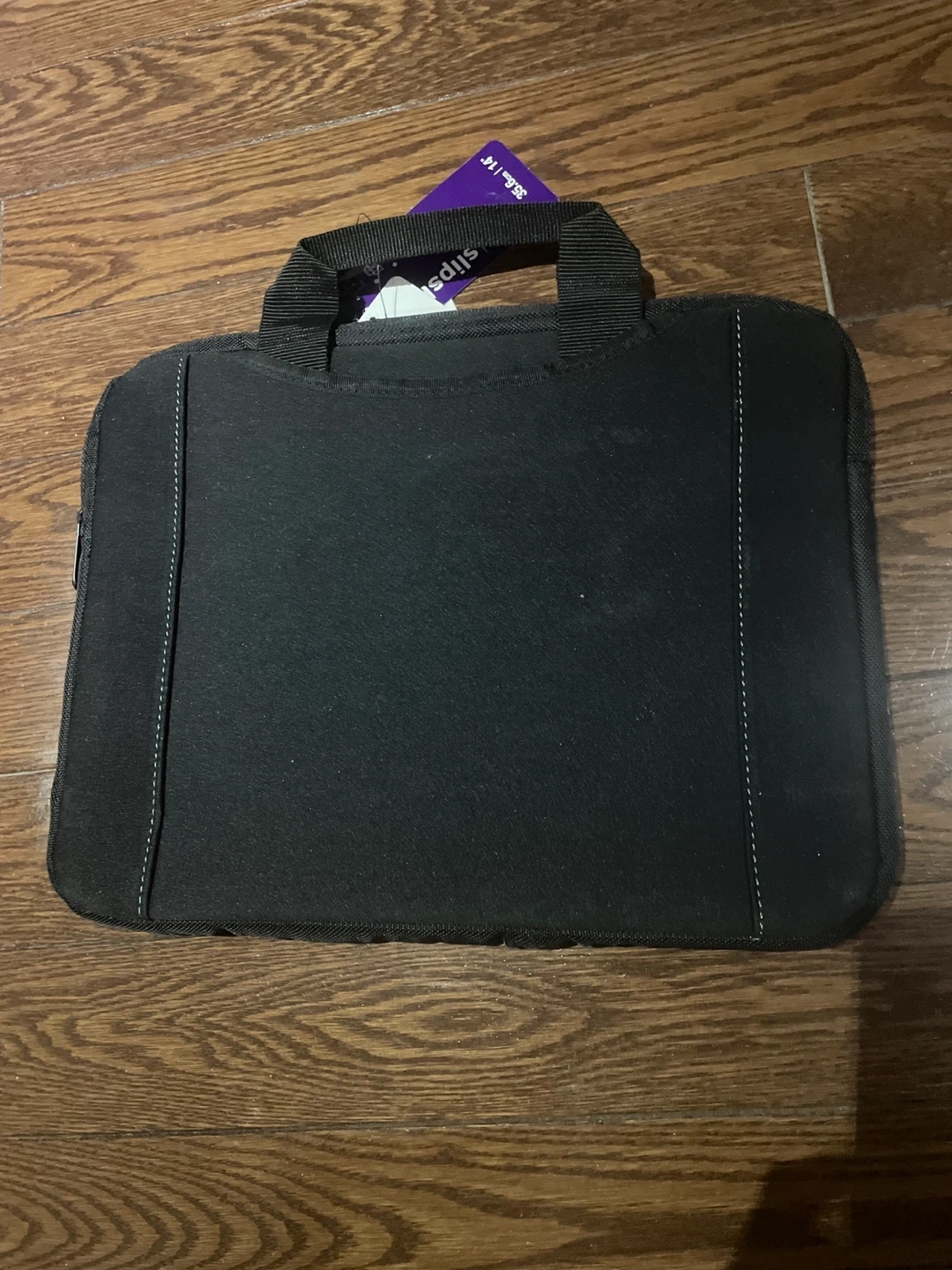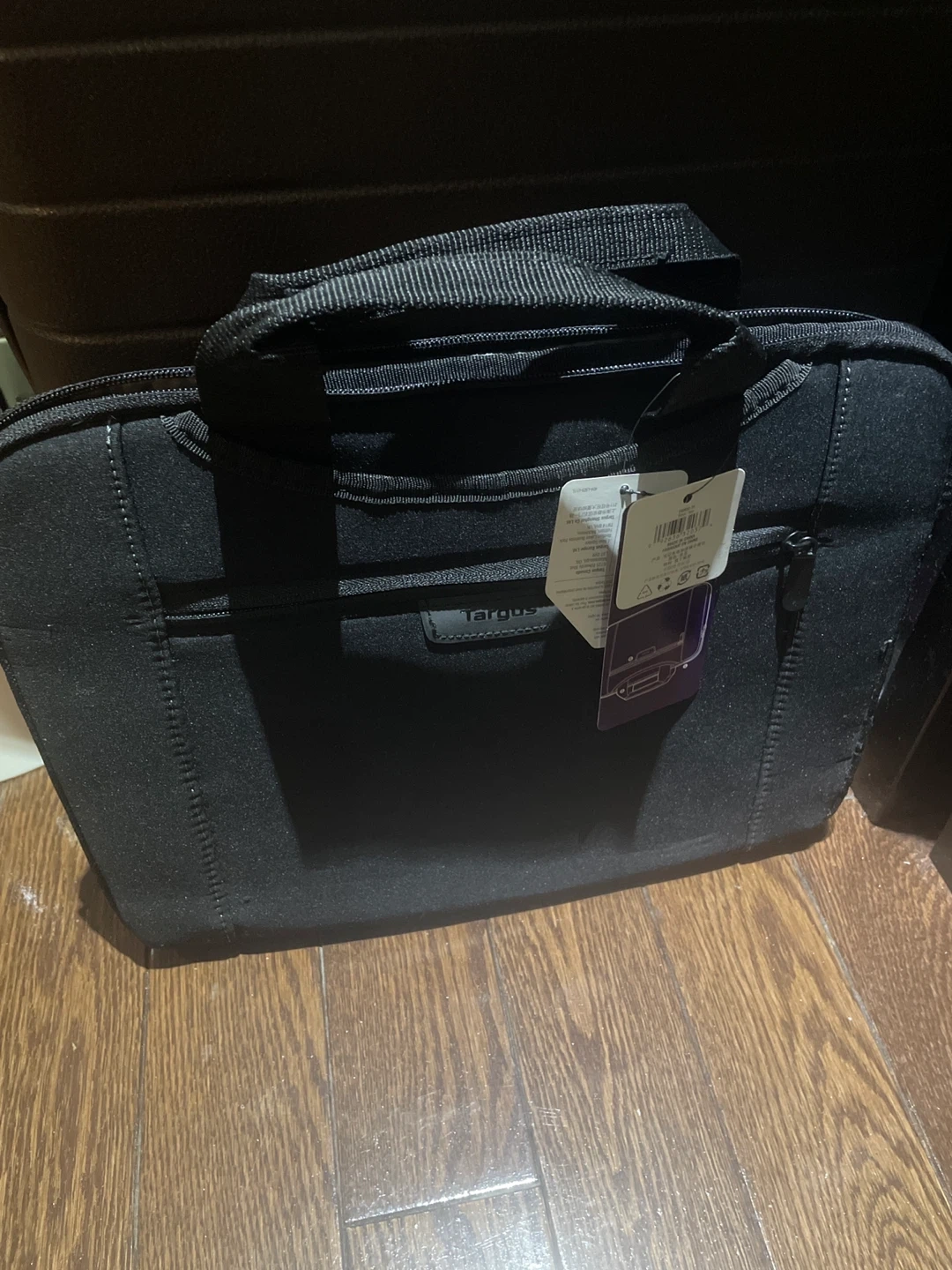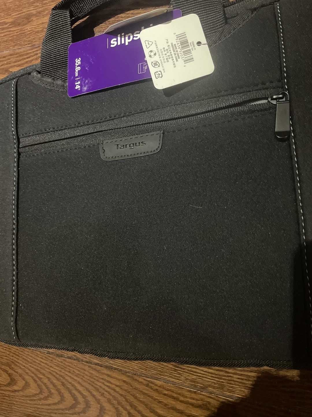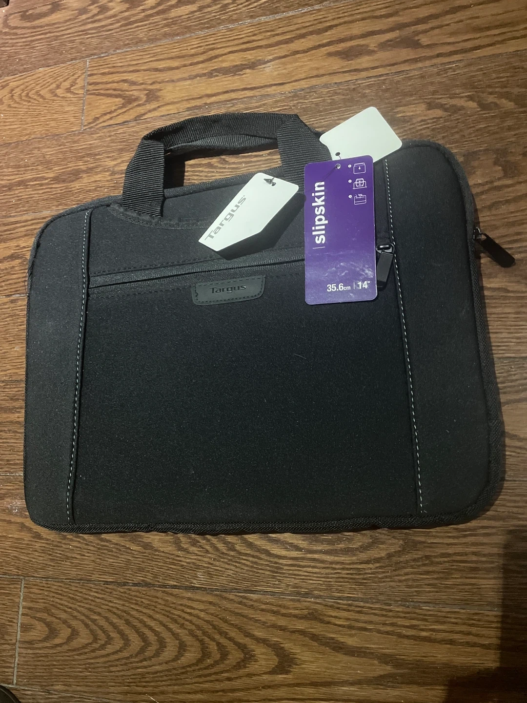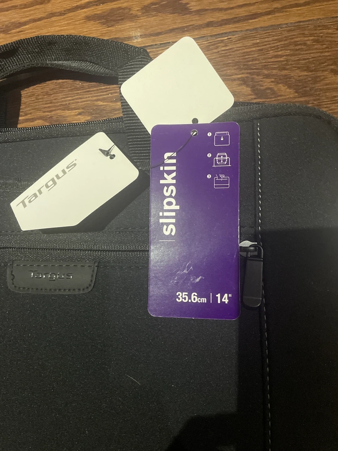 This Targus Slipskin laptop bag is black and designed for 14-inch laptops. It's made from durable material and features a padded interior. The bag has handles and a zippered closure for secure storage.