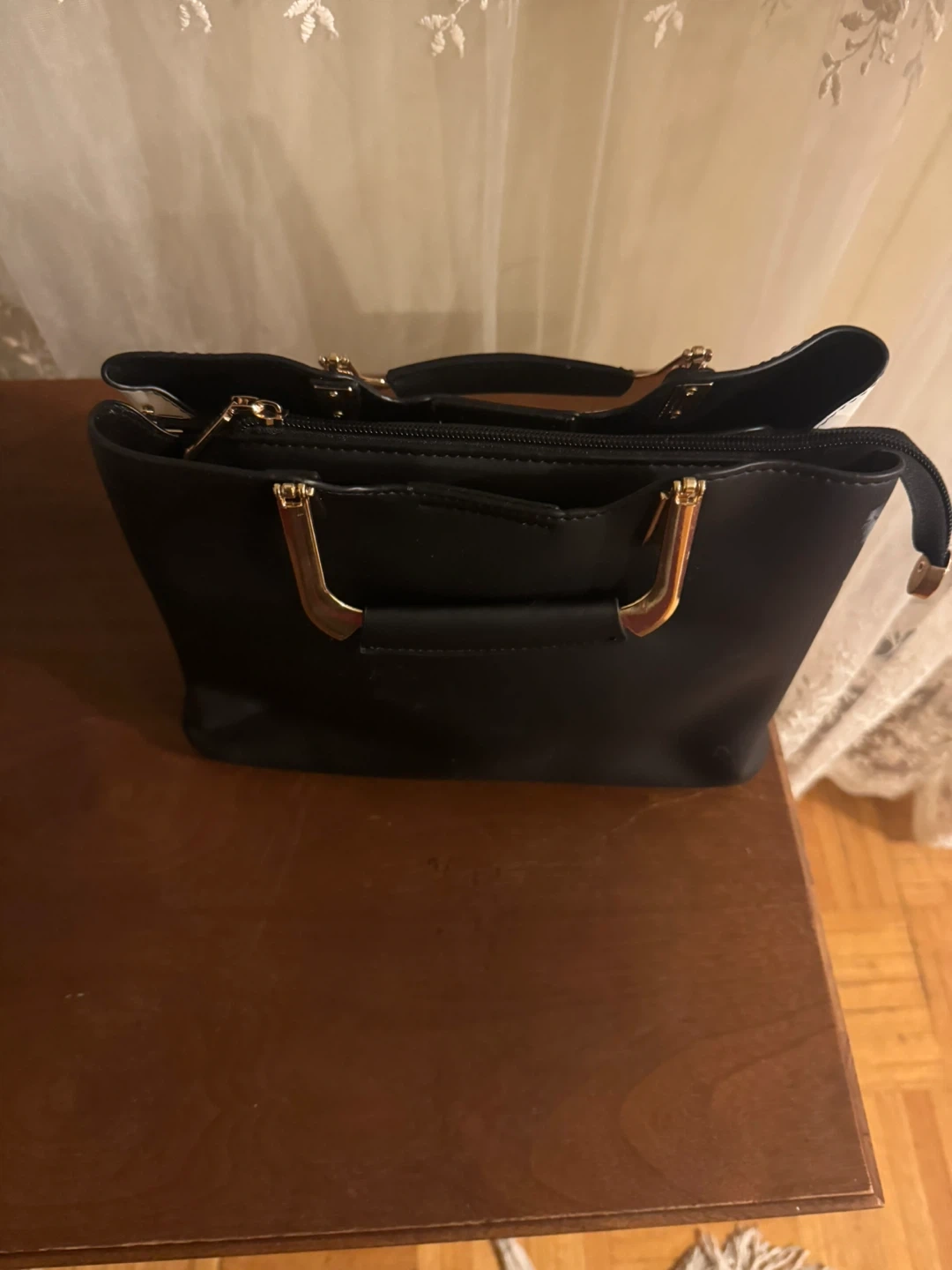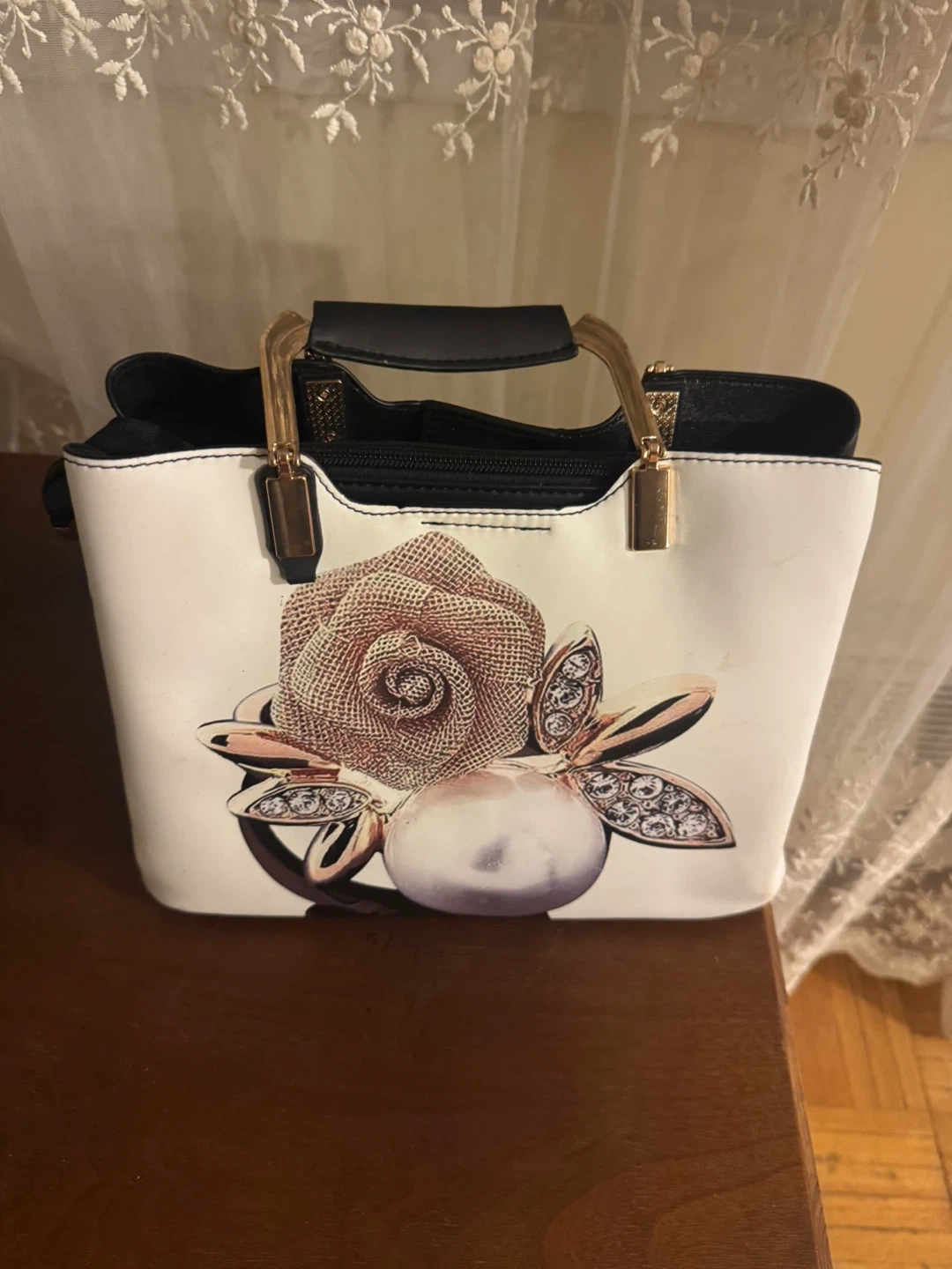 A stylish white tote bag featuring a decorative rose and pearl embellishment. It has black handles and a black interior with a zip closure. This bag is perfect for adding a touch of elegance to any outfit!