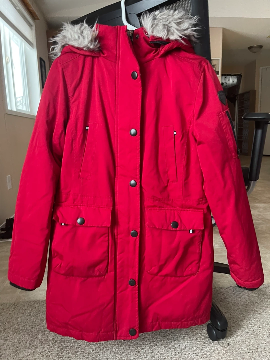 A warm, red parka-style coat designed for colder weather. It features a faux fur-lined hood and a button and zipper closure. Multiple pockets are included for convenience.