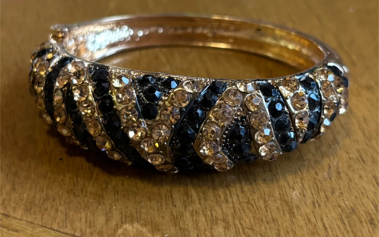 This bangle bracelet features a bold black and gold striped design with sparkling rhinestones. It's a hinged style for easy wear. The metal appears to be gold-toned.