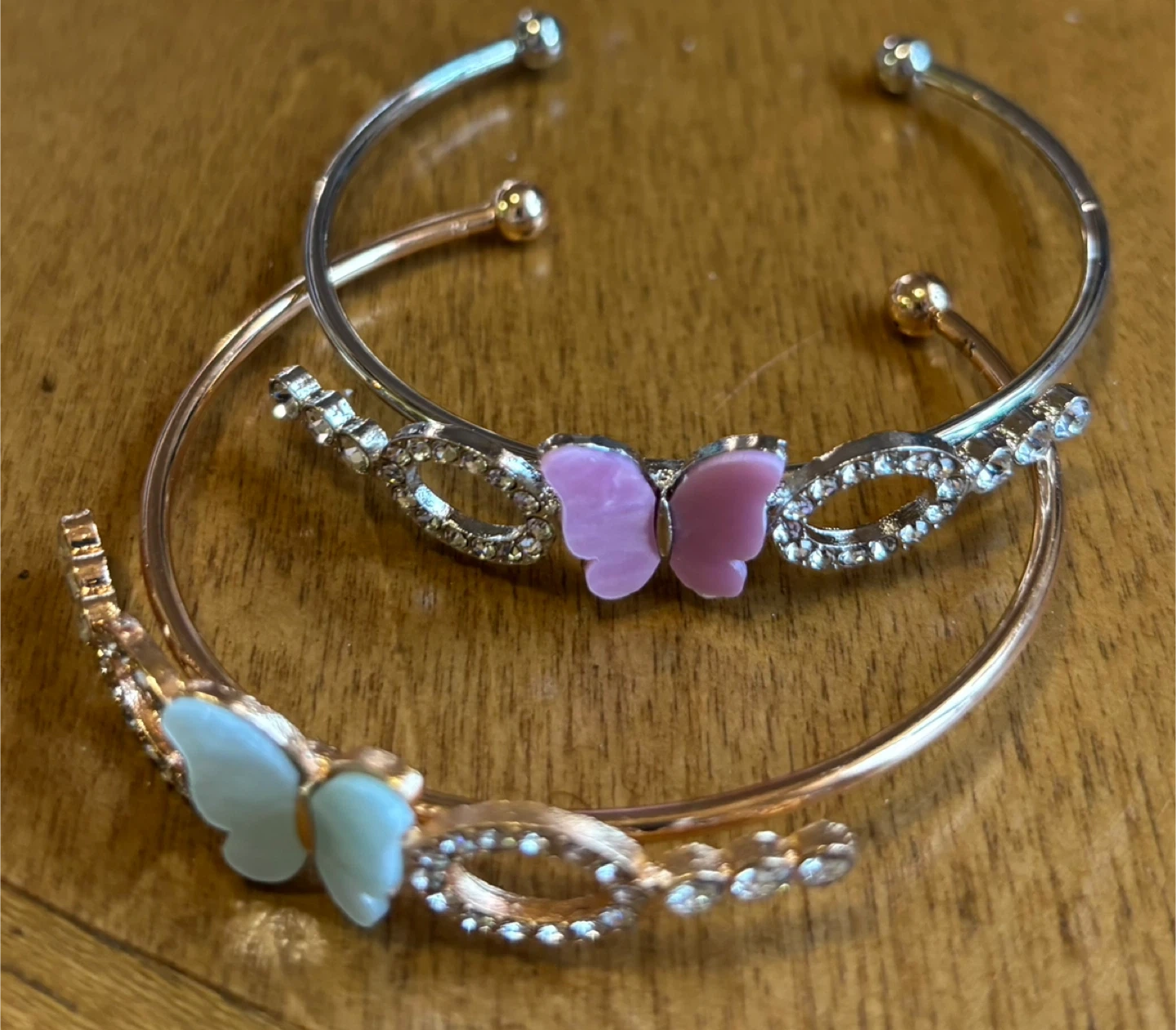 This set includes two cuff bracelets. One bracelet features a rose gold tone with a pale pink butterfly and rhinestone accents. The other bracelet has a silver tone with a pale mint green butterfly and similar rhinestone detailing. They're a lovely accessory for everyday wear!