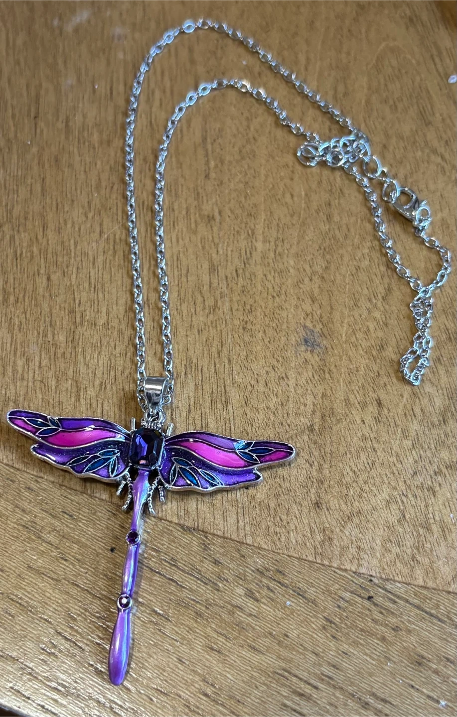 A beautiful dragonfly pendant necklace with purple and pink enamel wings. It features a faux jewel in the center and a metallic chain. This necklace adds a touch of color to any outfit!