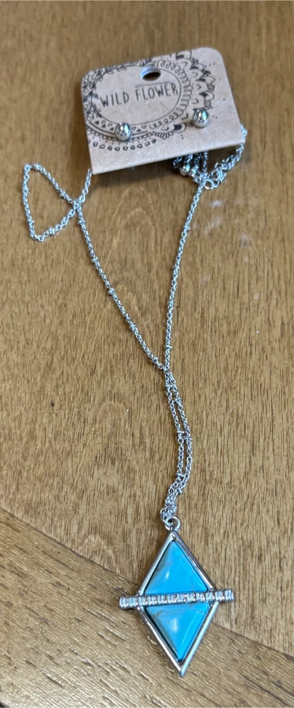 This is a Wild Flower necklace and matching stud earrings set. The necklace features a silver-toned chain with a turquoise diamond-shaped pendant. The earrings are simple silver studs.