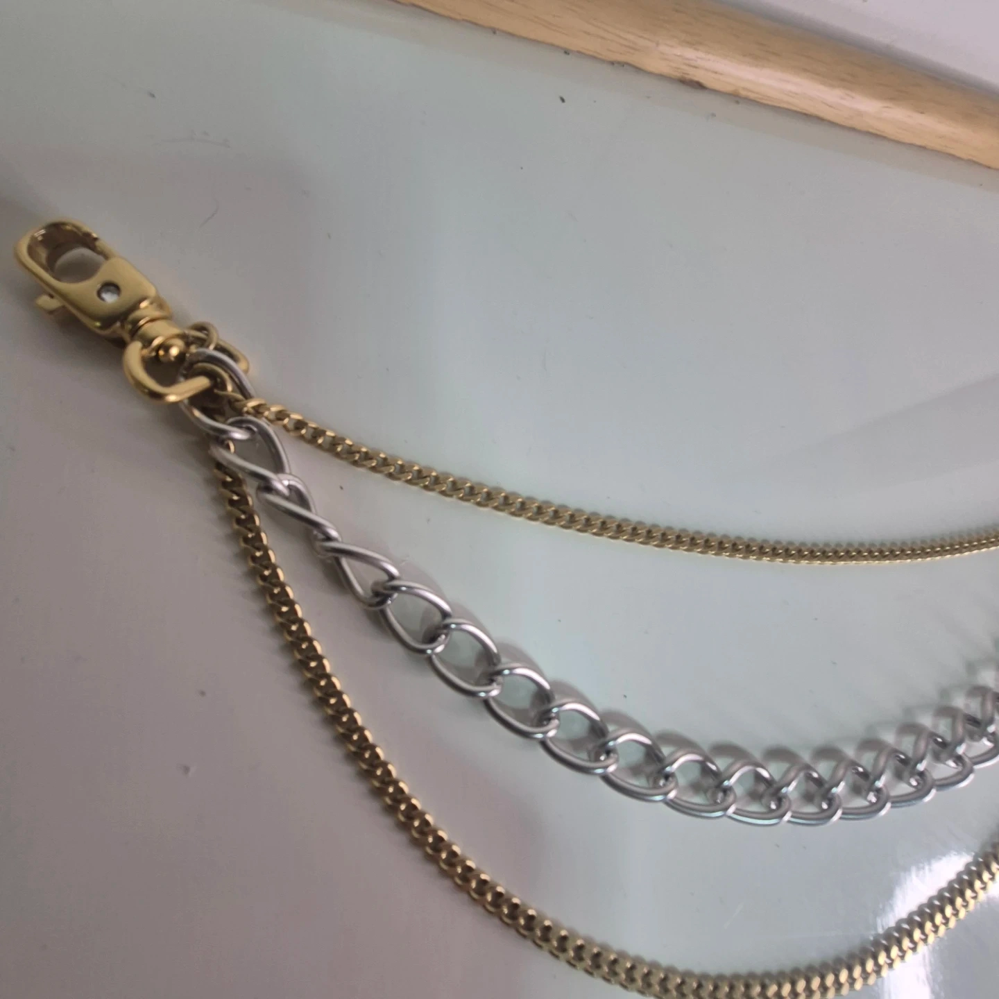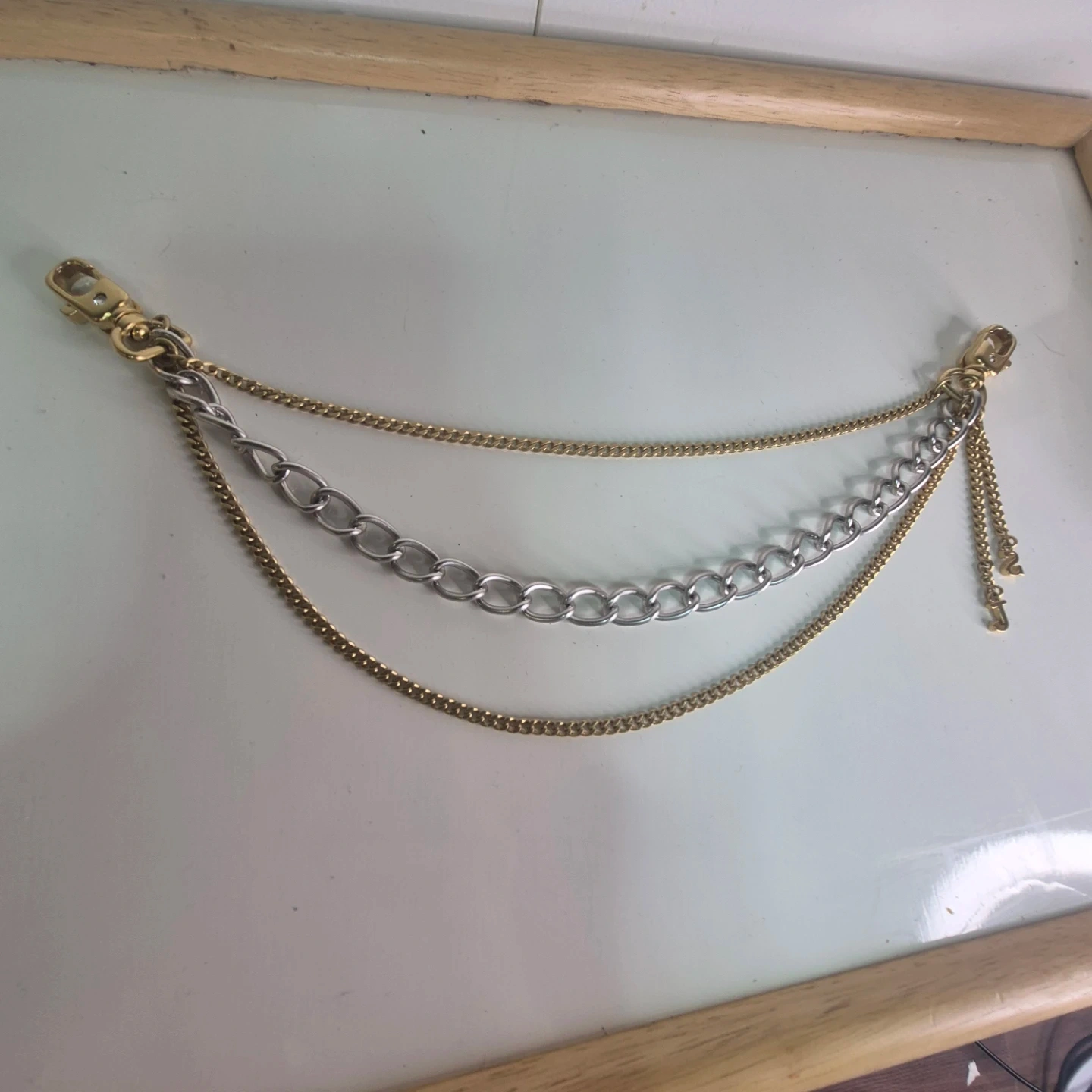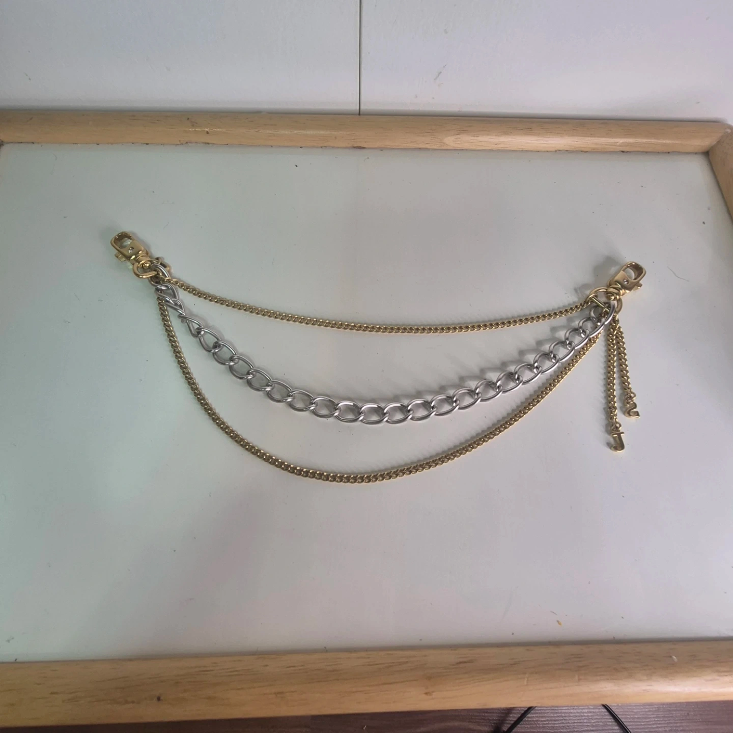 This layered chain features a mix of silver and gold-tone metal links. It has two lobster clasps for easy attachment. This chain can add a stylish accent to bags or pants.