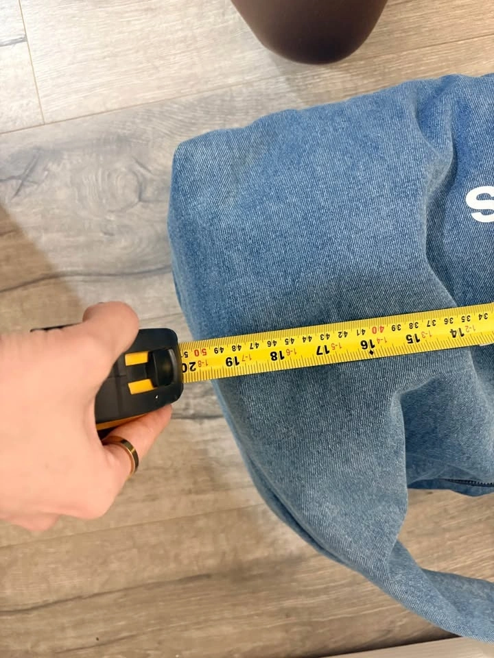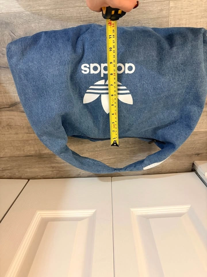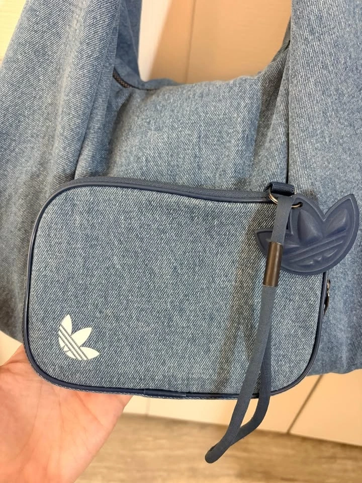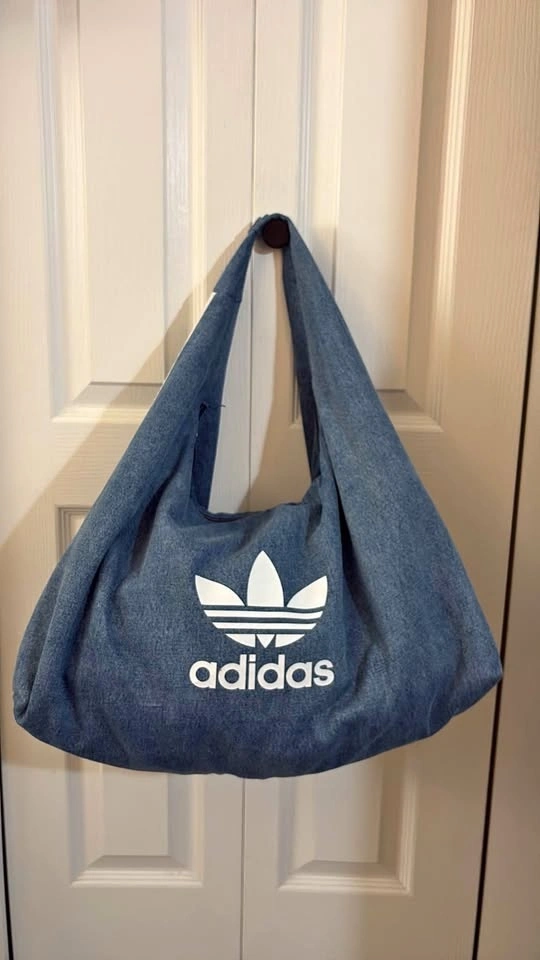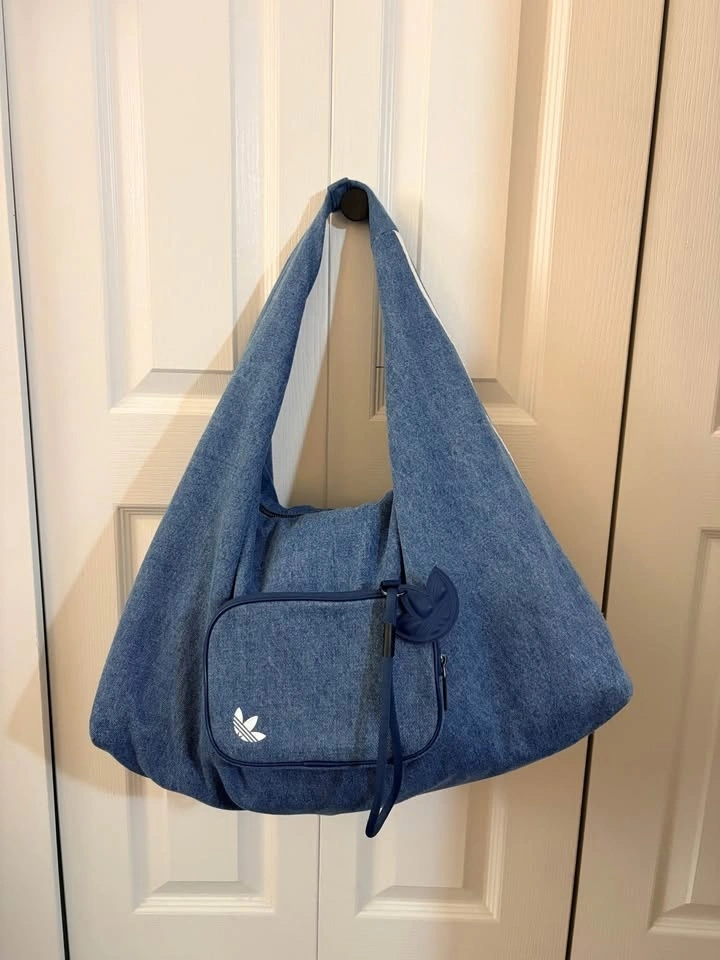 Spacious Adidas hobo shoulder bag made from a cool denim-like fabric in blue. Features a large white trefoil logo on the front. Includes a matching detachable pouch, also with a trefoil logo. Comfortable strap.