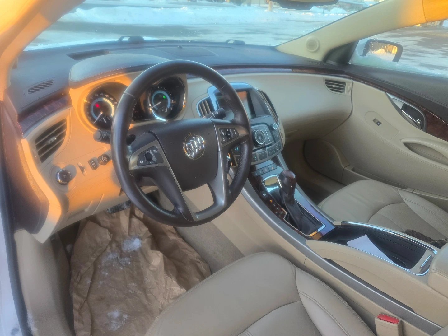 This is a white Buick LaCrosse sedan with leather interior. It features a comfortable ride and spacious cabin. Great for daily commutes or family trips!