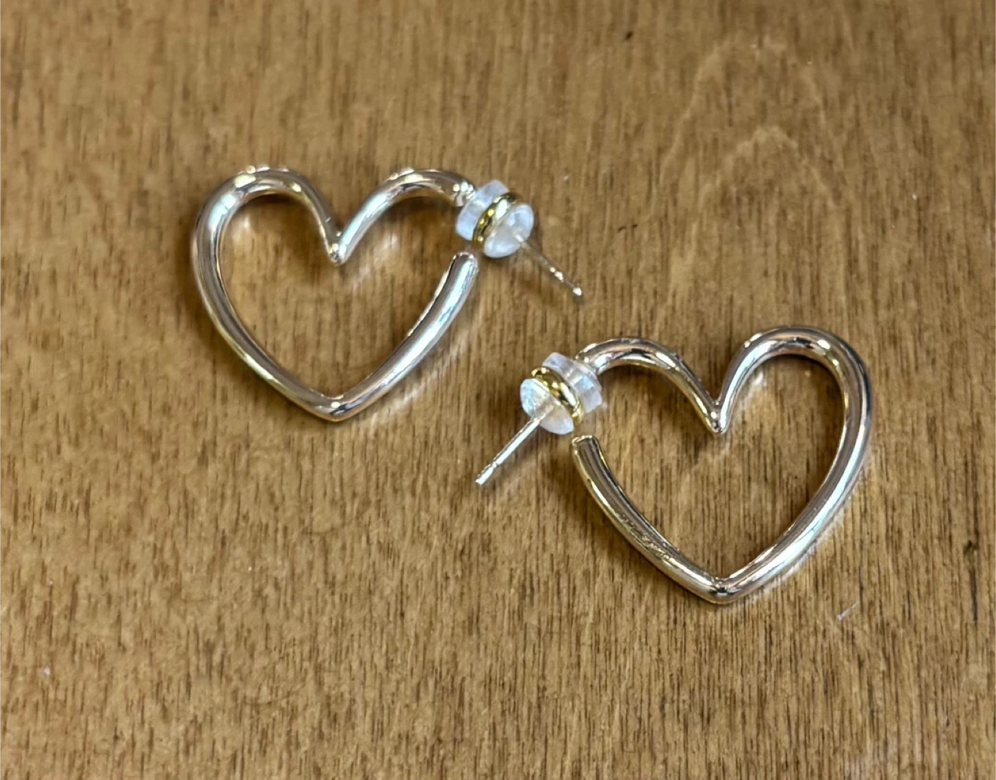 These are gold tone heart-shaped hoop earrings. They feature a polished finish and come with clear plastic and gold-tone backs. These earrings add a sweet touch to any outfit!