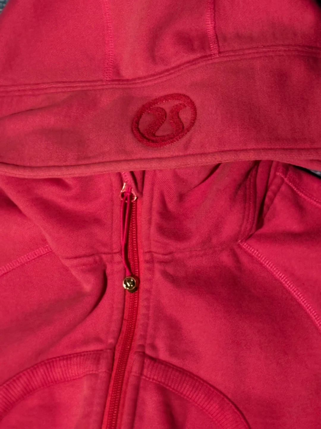 This is a bright pink Lululemon zip-up hoodie. It's made from a soft material and features a full zipper closure and a hood. It's perfect for casual wear or light athletic activities.