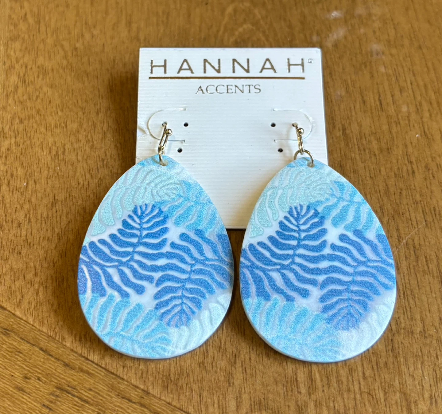 Hannah Accents shell teardrop earrings with a blue fern pattern. Lightweight and fun statement earrings!