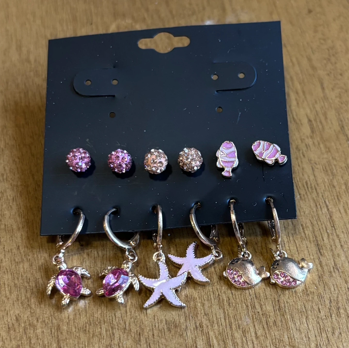 This set includes six pairs of earrings. You'll find sparkly stud earrings and fun dangle earrings with charms shaped like turtles, starfishes, and whales. It's a cute collection for everyday wear!