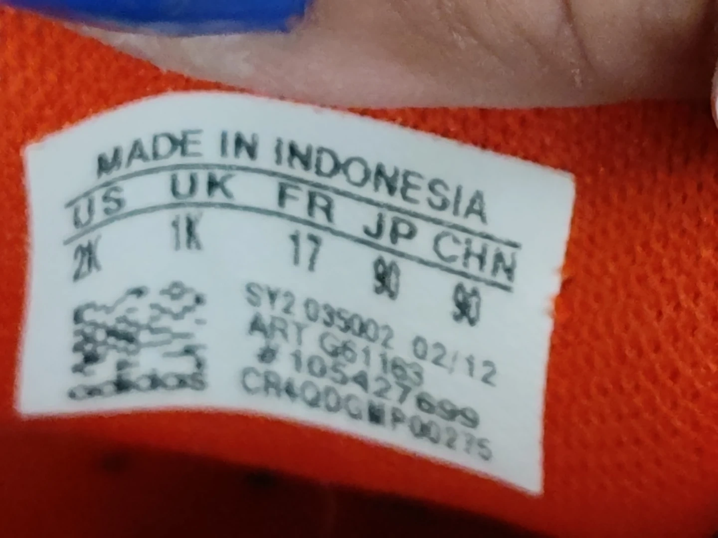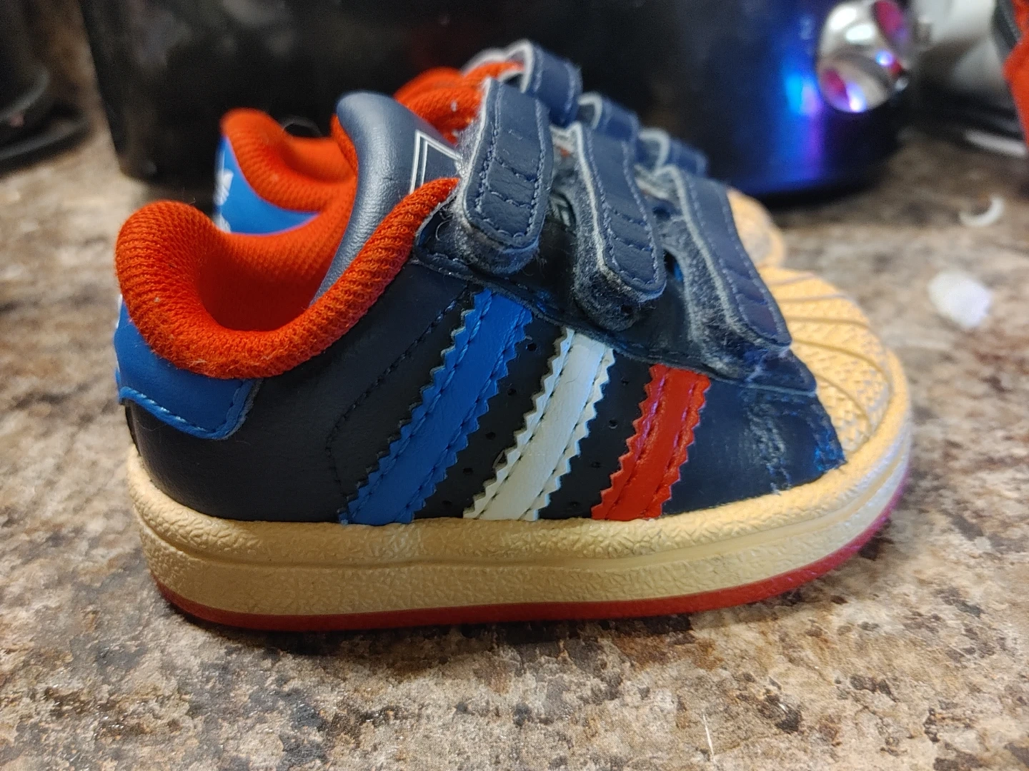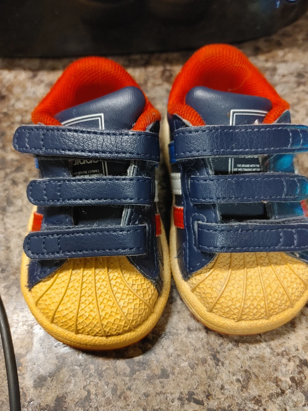Adidas Superstar crib shoes in toddler size 2K. These navy blue and red shoes feature the classic three stripes and hook-and-loop closures. Made in Indonesia.