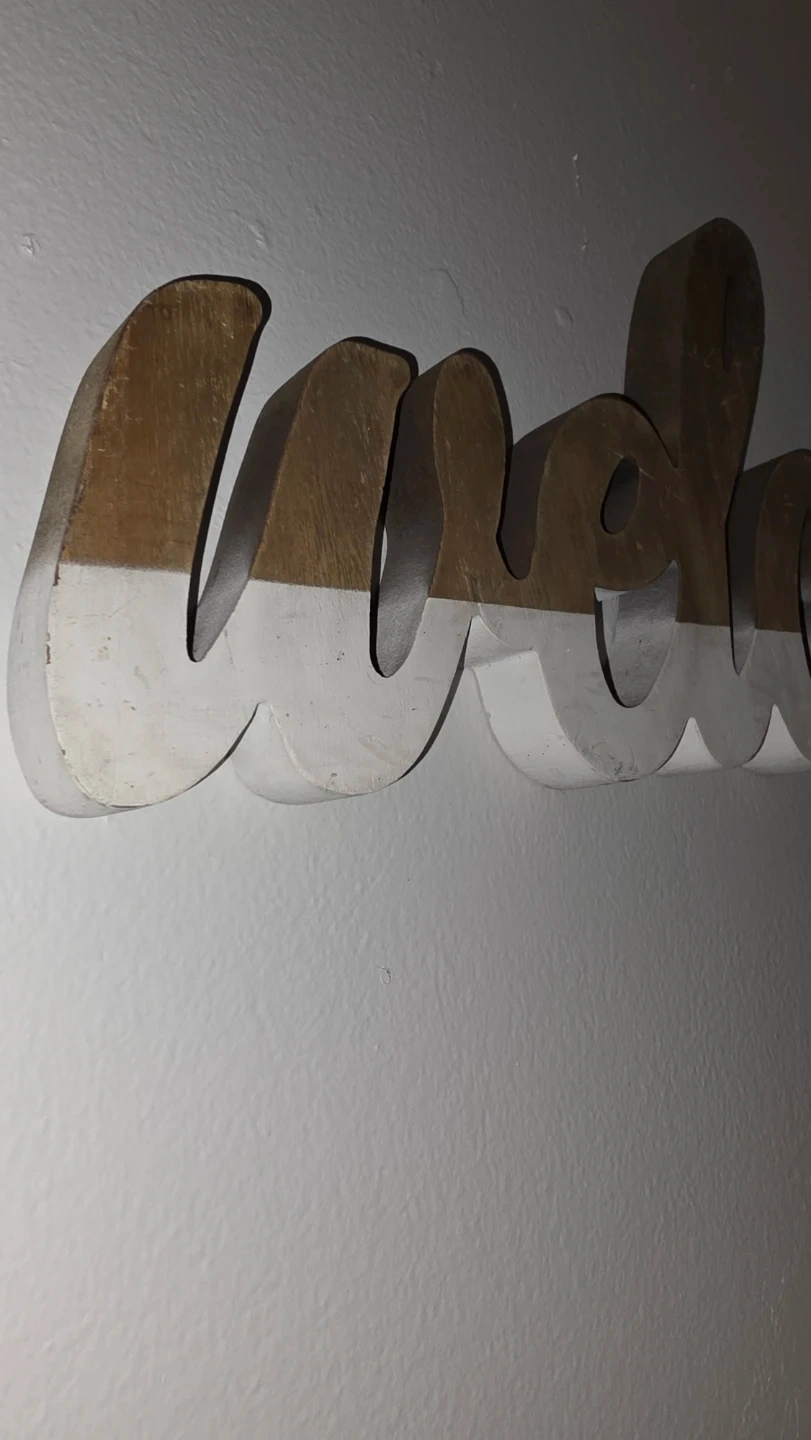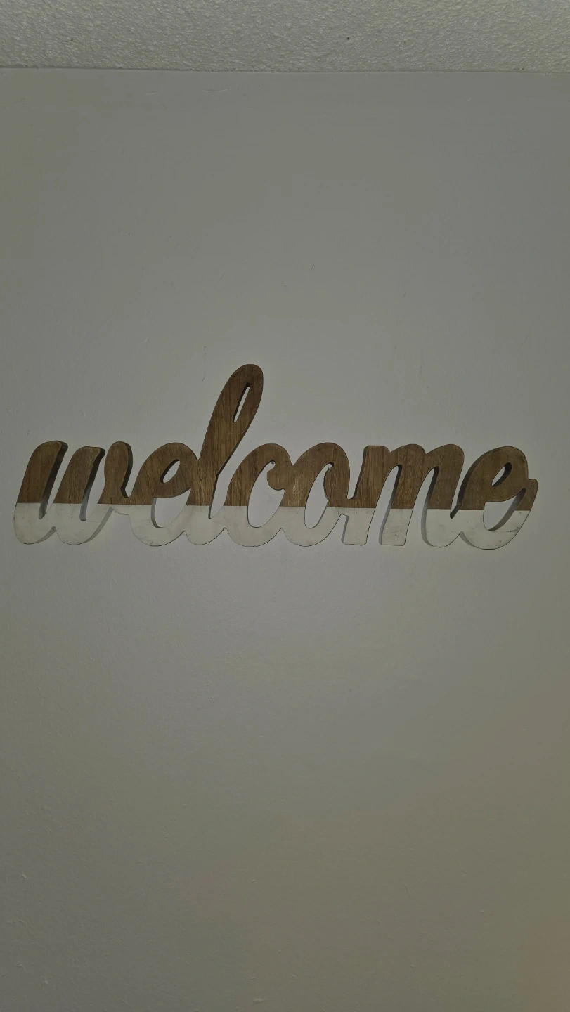 This wooden sign spells out "welcome" in a lovely cursive font. It's half natural wood finish and half painted white, giving it a rustic yet modern look. It's perfect for hanging on a wall near your entryway or in any room you'd like to add a welcoming touch!