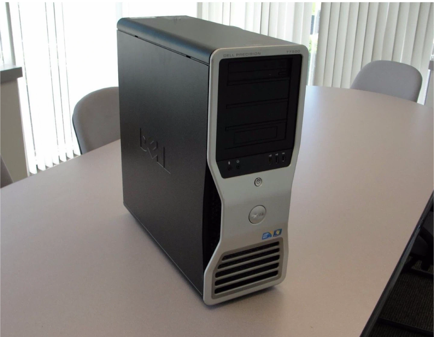 Dell Precision T7500 workstation computer. Black and silver tower. It has a robust internal component layout, suitable for demanding tasks. Includes ample space for expansion.