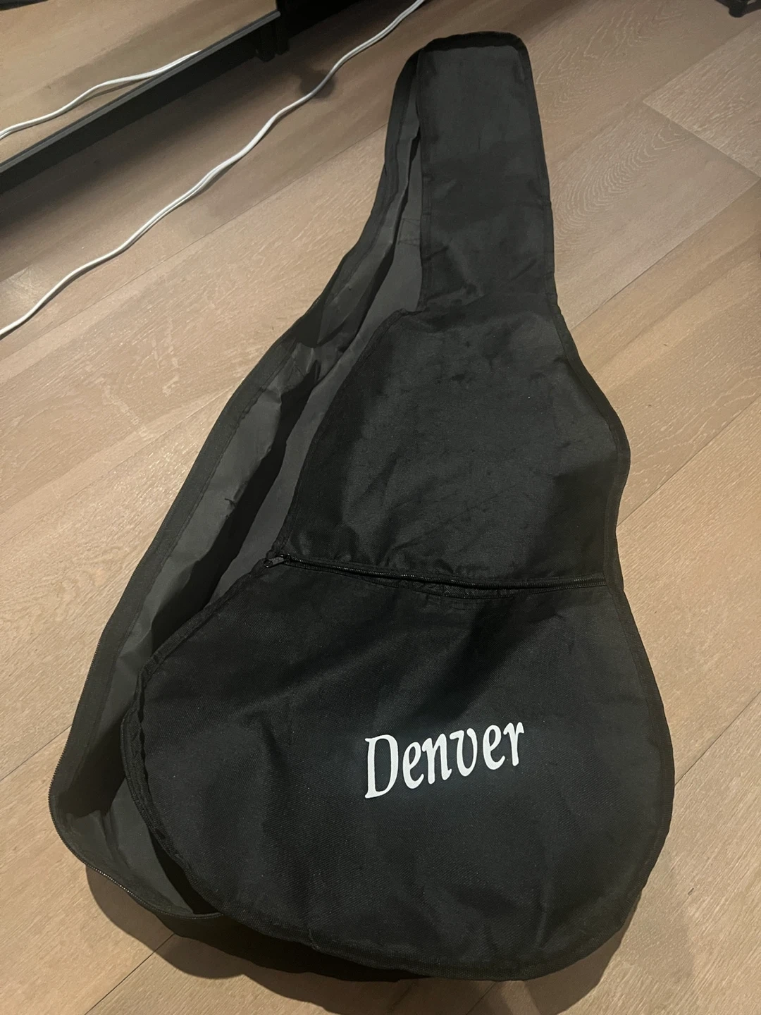 Black padded gig bag for a guitar. It's made of durable nylon material and features adjustable shoulder straps for carrying. There's also a front pocket for accessories, all zippers working. Denver logo on front, recently cleaned for storage. No longer have guitar.