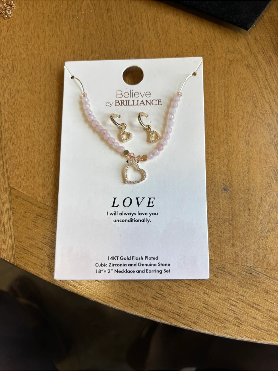 This is a 14KT gold flash plated necklace and earring set. It features cubic zirconia and genuine stone accents. The necklace is 18" and the set includes a 2" extender.