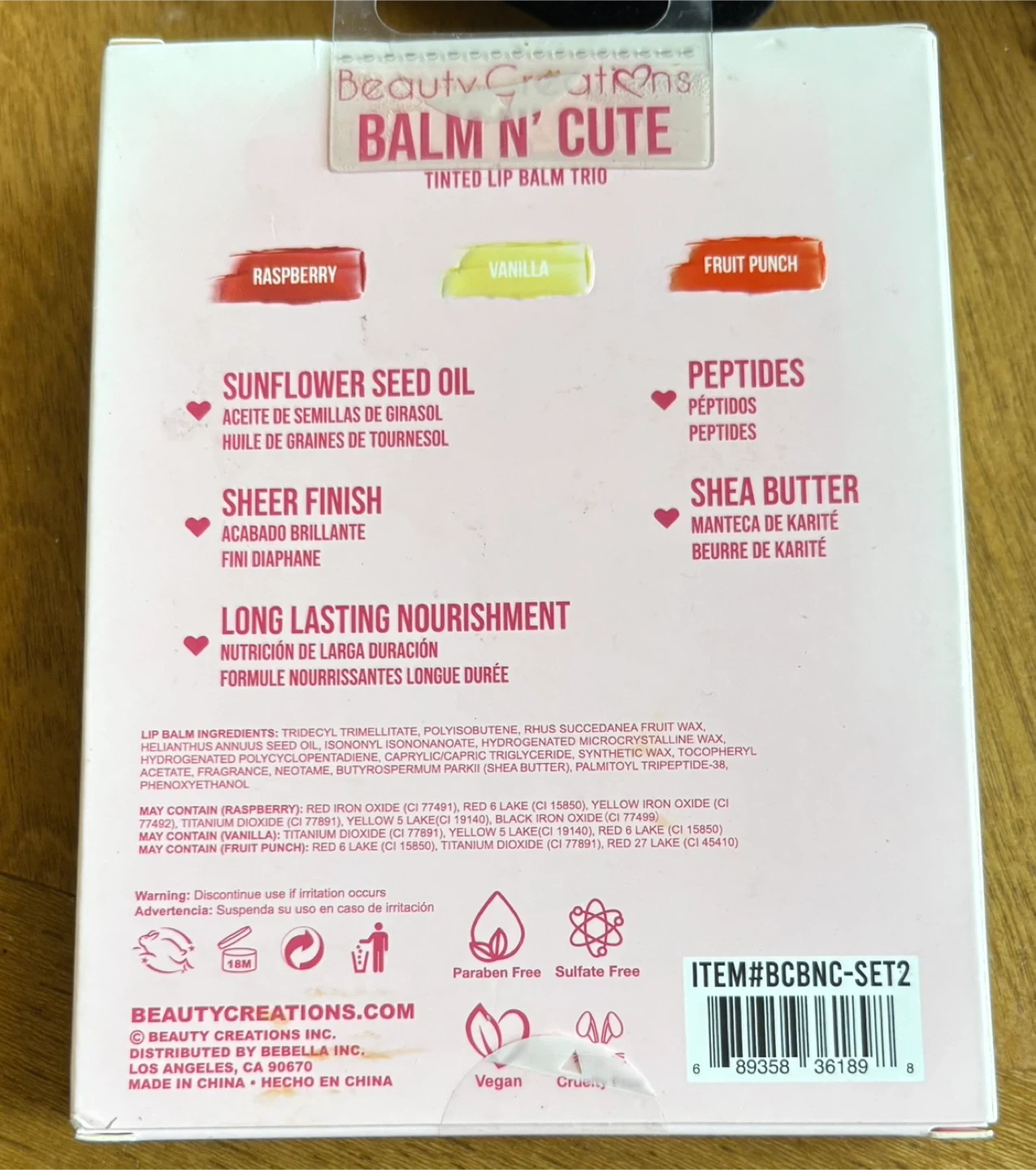 This is a 3-piece tinted lip balm set from Beauty Creations. It includes shades for Raspberry, Vanilla, and Fruit Punch. The formula features sunflower seed oil, peptides, and shea butter for long-lasting nourishment.