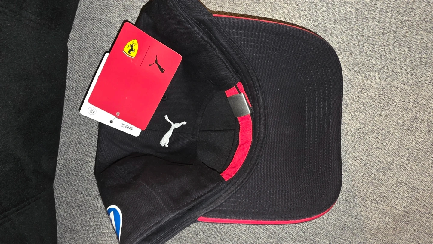 This is a black Puma Scuderia Ferrari cap. It features the iconic Ferrari logo along with HP sponsor logo and a red brim accent. The cap is adjustable for a comfortable fit.