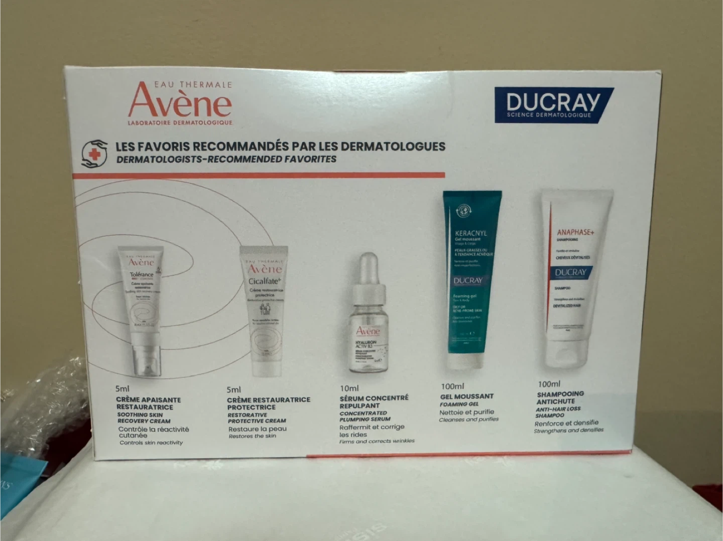 This set includes Avène Soothing Skin Recovery Cream (5ml), Restorative Protective Cream (5ml), and Hyaluron Active B3 Concentrated Plumping Serum (10ml). It also features Ducray Keracnyl Foaming Gel (100ml) and Anaphase+ Anti-Hair Loss Shampoo (100ml). These dermatologist-recommended favorites are great for various skincare and haircare needs.price is firm .
