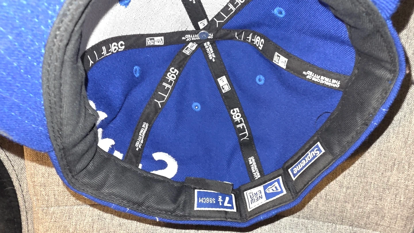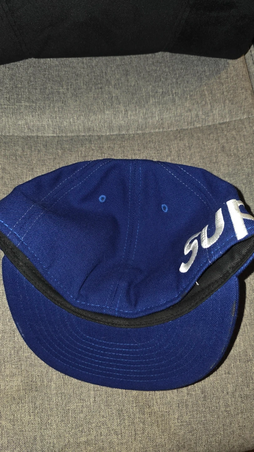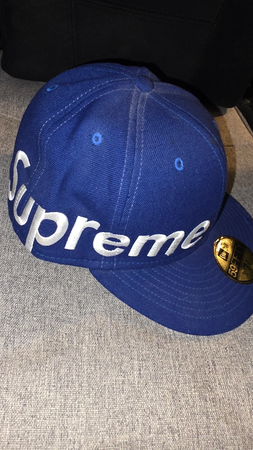 Blue Supreme fitted hat with white 'Supreme' logo. New Era 59FIFT. Features 'World Famous' embroidery on the brim side.