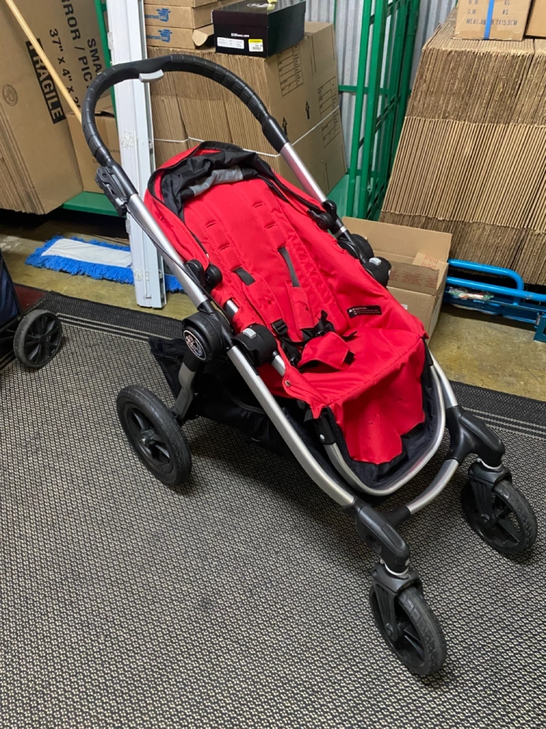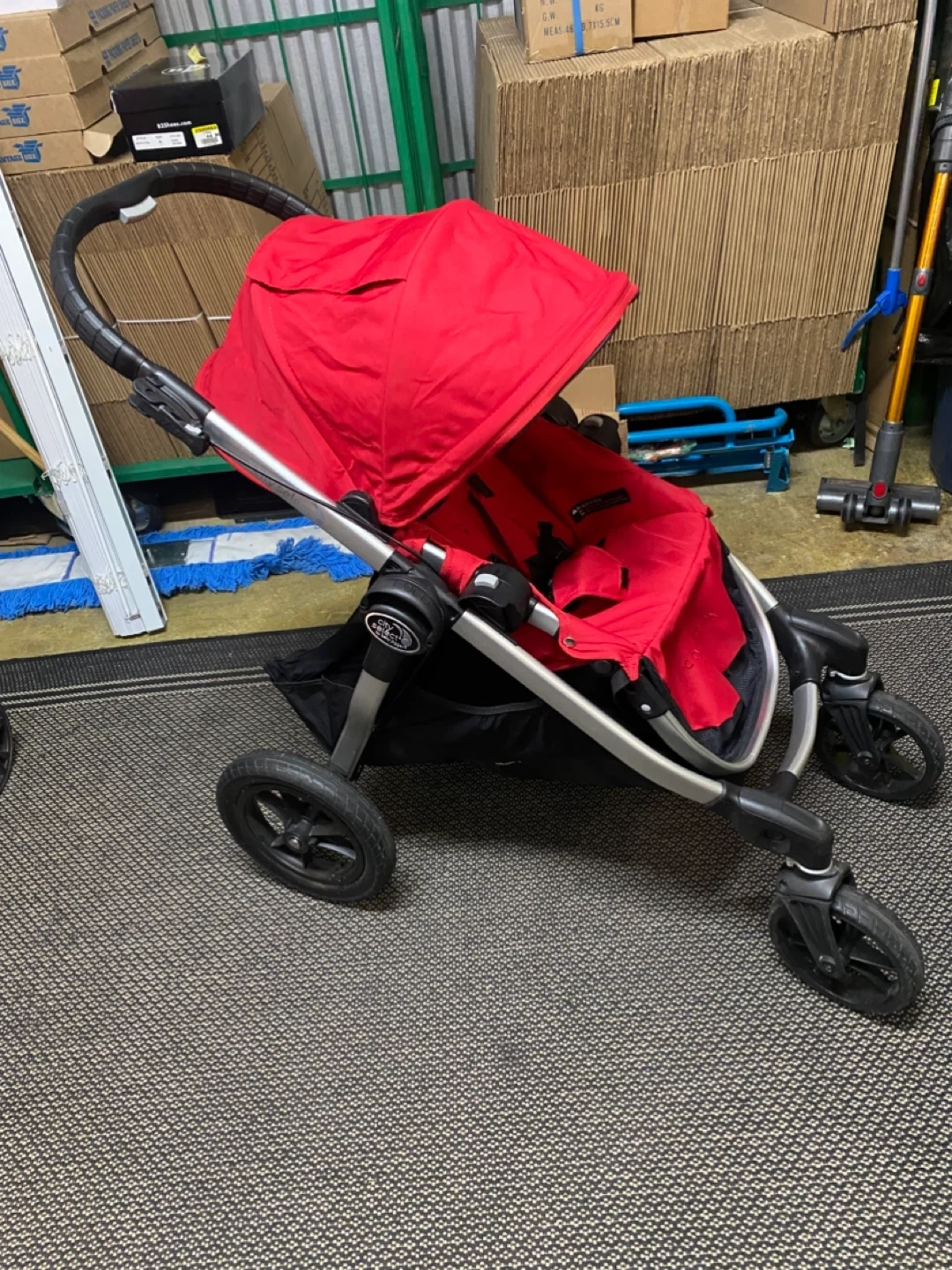 This Baby Jogger City Select stroller comes in a vibrant red. It features a reversible seat and adjustable handlebar. Great for on-the-go adventures with your little one!